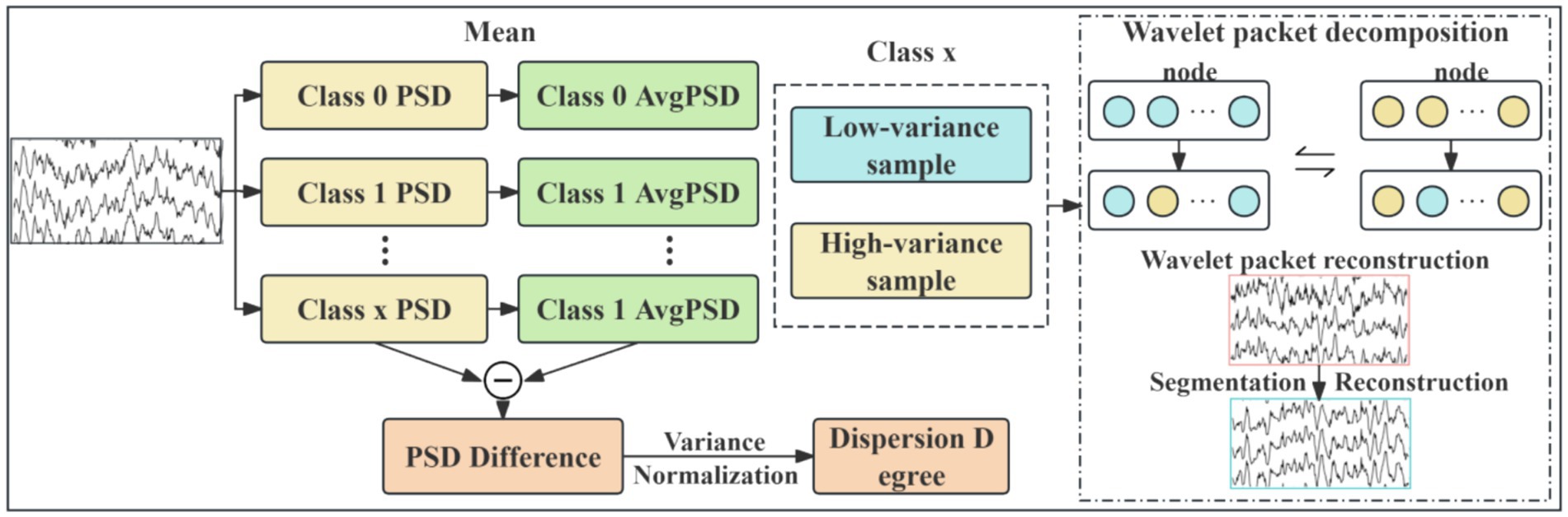 1. Power spectral density calculation and intra-class grouping: compute PSD for each sample and categorize them into low-variance and high-variance groups within each class.