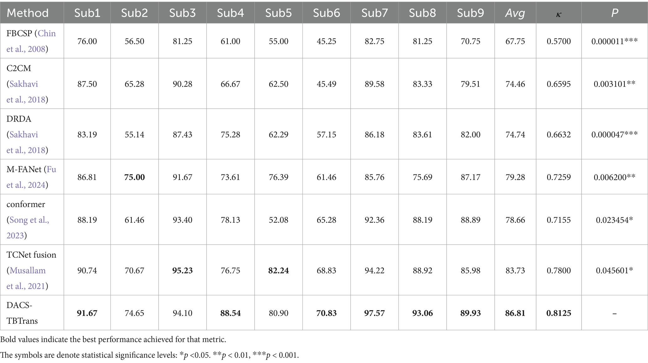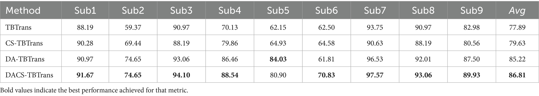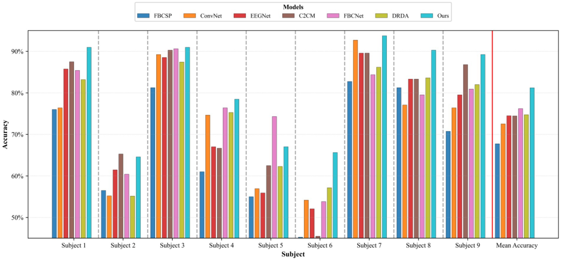 While models like FBCSP, C2CM, and M-FANet are capable of extracting features from EEG signals, they may not fully capture the long-term temporal dependencies that are crucial for accurate classification. Similarly, DRDA, though it enhances model robustness by incorporating data from other subjects, still lags behind our method in classification accuracy for every subject. Although TCNet Fusion achieved the highest accuracy in Subjects 3 and 5, our method attained the second highest. Given our method’s significant superiority in Subjects 1, 4, 6, 7, 8, and 9, TCNet Fusion’s overall accuracy remains lower than ours. This is evident from the high accuracy rates across multiple subjects, particularly in Subjects 4 and 7, where it achieved 93.06 and 97.57% accuracy, respectively.