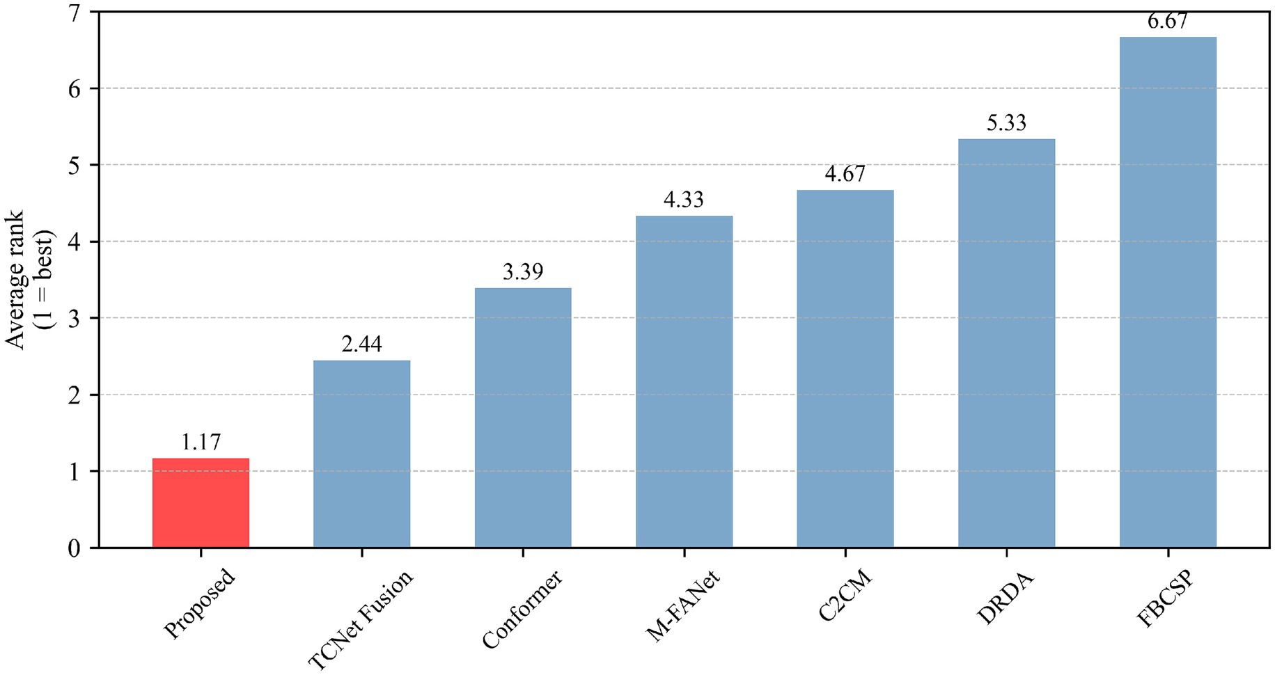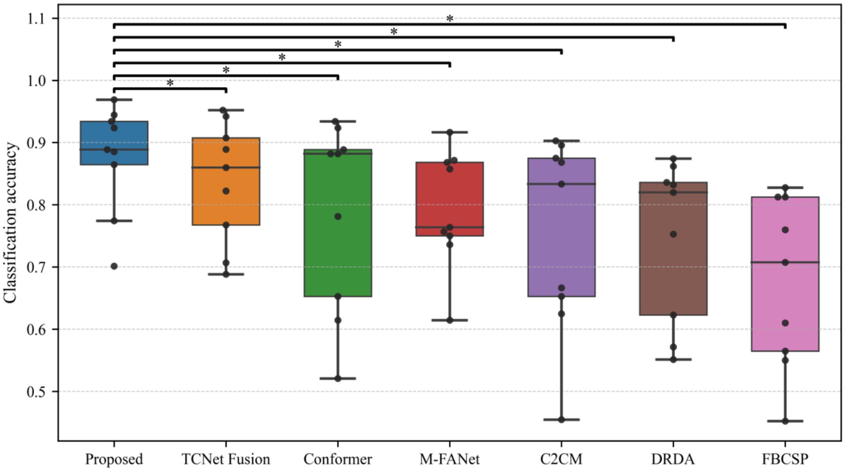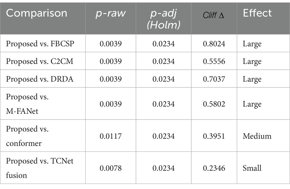 Our model underwent the Wilcoxon signed-rank test, Holm–Bonferroni correction, and ranking based on the Friedman test. As can be seen from Table 2, all comparisons (between the proposed model and other models) have p-values less than 0.05 after applying the Holm–Bonferroni correction, indicating that these comparisons are statistically significant. That is, the proposed model shows a significant difference in classification accuracy compared to other models. The effect size indicates a large effect for comparisons between the proposed model and FBCSP, C2CM, DRDA, and M-FANet, suggesting that the proposed model performs significantly better in these comparisons. The comparison between the proposed model and conformer shows a medium effect size, indicating that although the proposed model performs better, the difference is not as significant as in the previous comparisons. The comparison between the proposed model and TCNet Fusion shows a small effect size, indicating a smaller performance difference between the two. After applying the Holm–Bonferroni correction, the p-values for all comparisons are slightly higher than the original p-values but still less than 0.05, demonstrating that the differences between the proposed model and other models remain significant even when controlling for multiple comparison errors. The identical adjusted p-values may be due to the original p-values of each comparison being very close, resulting in the same ranking and thus the same correction factor. It can be observed from the figures that our model exhibits stable classification performance across subjects, with low variability in the data. It performs the best in both classification accuracy and average ranking, and the differences compared to other models are statistically significant.
