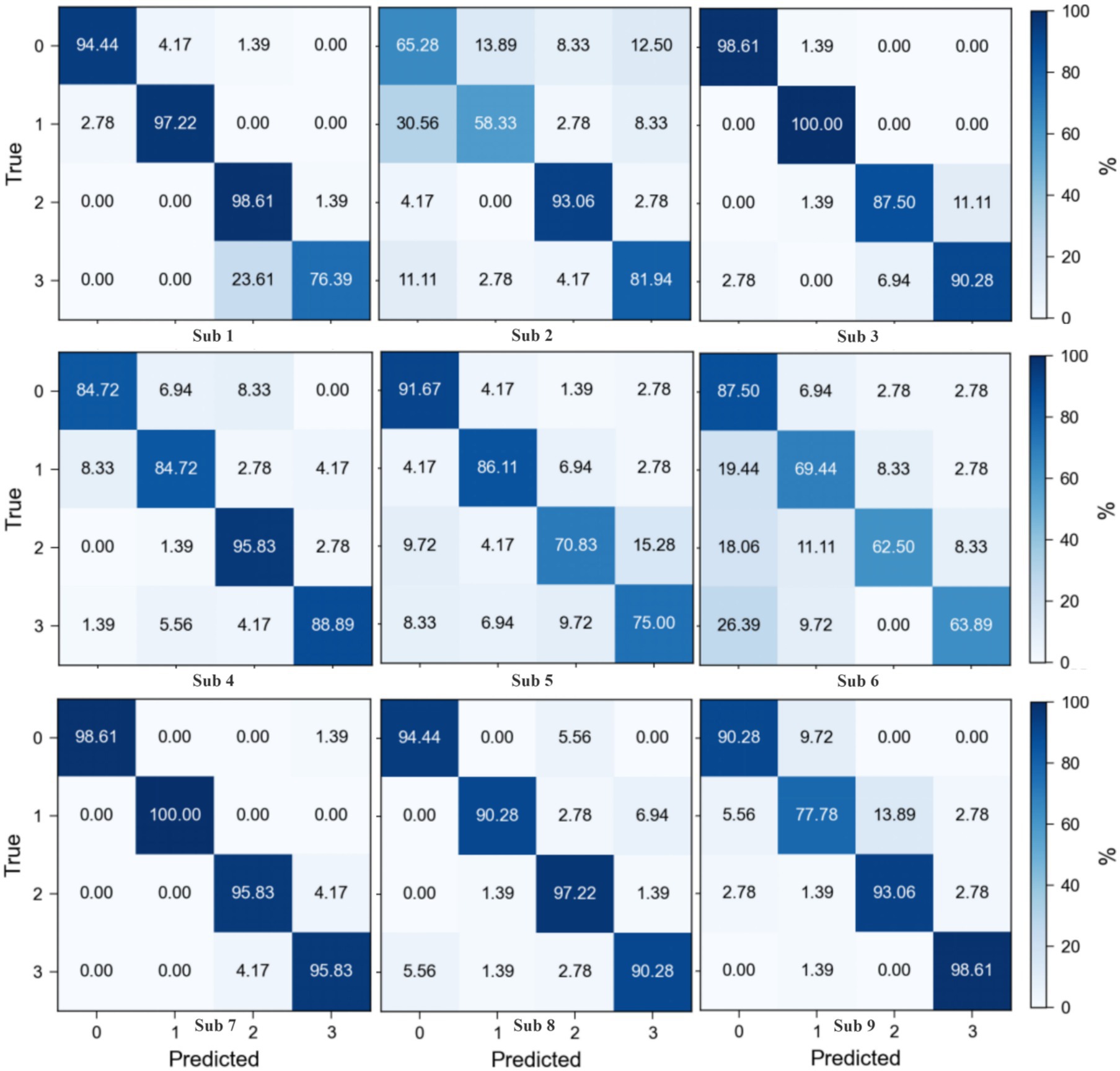 The confusion matrices for the Motor Imagery Dataset 2a (Figure 6) reveal a varied classification performance across subjects, highlighting the complexity of EEG signal decoding. Subjects 1, 3, 8, and 9 demonstrate superior classification accuracy, as evidenced by the high values along the diagonal of their respective matrices, indicating a robust discrimination capability of the proposed method in decoding EEG signals associated with motor imagery tasks. In contrast, Subjects 2, 4, 5, and 6 exhibit relatively poorer performance, with a notable increase in off-diagonal elements, suggesting a challenge in distinguishing between certain motor imagery classes. Notably, for Subject 2, Class 2 (tongue motor imagery) achieves the highest classification accuracy, aligning with previous findings that suggest a distinct neurophysiological signature for tongue motor imagery tasks. The observed misclassification between tongue (Class 3) and feet (Class 4) motor imagery tasks in Subjects 1, 3, 7, and 8 could be attributed to suboptimal channel selection, which potentially misses critical EEG features, thus warranting further investigation. The performance discrepancies across subjects underscore the necessity for subject-specific optimization strategies and highlight the importance of refining channel selection algorithms to enhance classification accuracy. Future work should focus on adapting the channel selection process to account for inter-subject variability in EEG signal characteristics, aiming to reduce misclassification rates and improve the overall robustness of EEG-based motor imagery decoding.