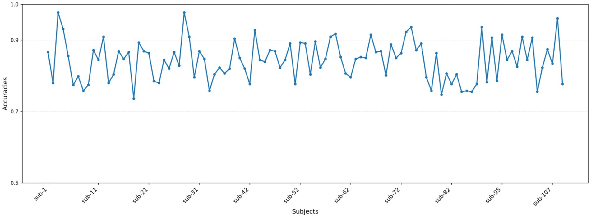The classification outcomes of the proposed method on the Physionet MI dataset, as detailed in Table 2 and depicted in Figure 7, showcase a marked improvement over existing baseline methods. These results were derived from an analysis that excluded data from Subjects 38, 88, 89, 92, 100, and 104 due to inconsistencies in sampling rates or labeling errors, leaving a total of 103 valid subject datasets for evaluation. The proposed method not only demonstrates a significantly higher average classification accuracy but also achieves peak accuracy of 97.61% in individual subjects, culminating in an overall average accuracy of 86.64%. This performance surpasses that of other state-of-the-art methods such as FBCSP, DeepConvNet, ShallowConvNet, EEGNet, EEGNet fusion, and MI-EEGNe, as evidenced by the comparative metrics presented. The superior performance of the proposed method can be attributed to its advanced feature extraction capabilities and robust classification strategy, which effectively leverage the nuances within EEG signal patterns associated with motor imagery tasks. This analysis underscores the proposed method’s potential as a leading approach in EEG-based motor imagery classification, offering enhanced accuracy and reliability for brain–computer interface applications.