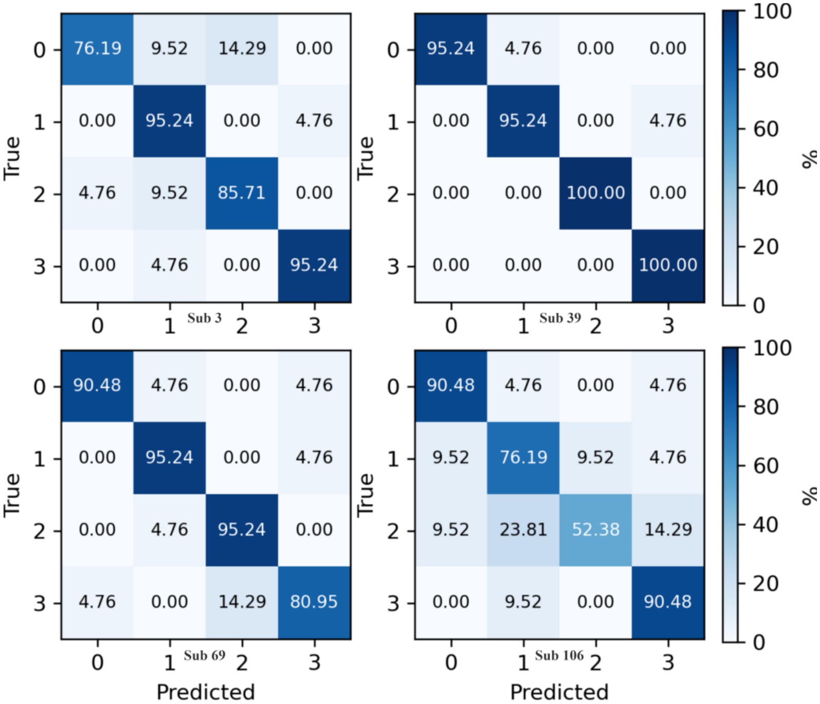 The confusion matrix for the proposed method on the Physionet MI dataset is presented in Figure 8. This matrix aggregates predictive outcomes from 10-fold cross-validation to generate the final classification results for each subject. Due to the extensive number of subjects, representative samples from Subjects 3, 39, 69, and 106 were selected for detailed analysis. Notably, Subject 106 exhibits significant intermixing between Class 1 and Class 2 data, corroborated by its relatively lower classification accuracy in Figure 5. This observation aligns with prior findings (Shuqfa et al., 2024), which document data recording anomalies and abnormally short trial durations for Subject 106. Consequently, exclusion of this subject’s data is methodologically justified.