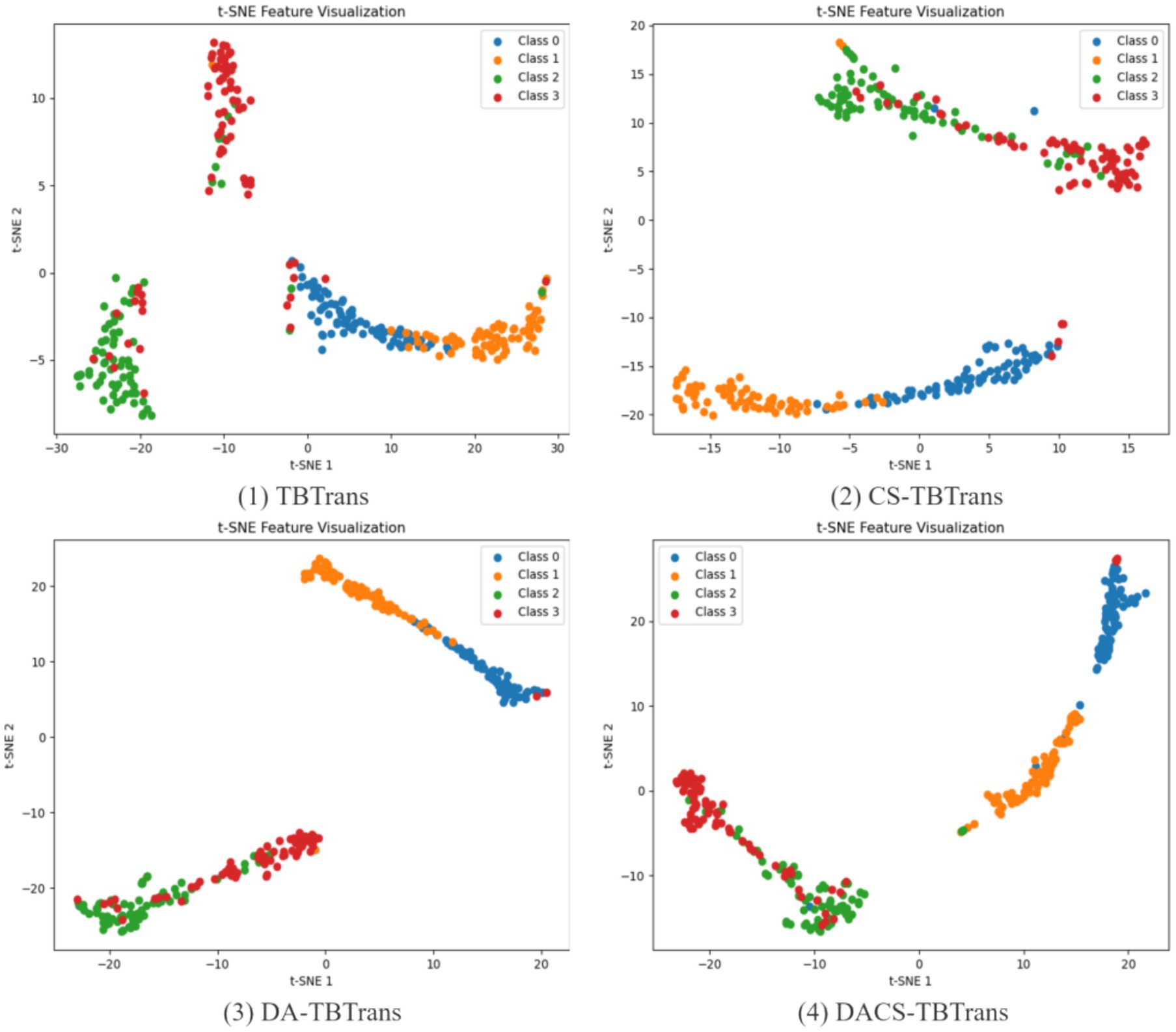 The analysis presented in Figure 9 illustrates the feature visualization for Subject 1 on the BCI Competition IV 2a dataset, highlighting the comparative effectiveness of the proposed DACS-TBTrans method against the baseline TBTrans model. It is evident that the standalone implementation of channel selection and data augmentation modules independently contribute to enhancing feature clustering across different classes. This improvement is characterized by a notable reduction in feature overlap when juxtaposed with the TBTrans model. The DACS-TBTrans approach exacerbates these positive effects by not only further concentrating class-specific features but also by achieving a successful isolation between Class 0 and Class 1. This strategic differentiation bolsters classification accuracy, although a considerable overlap between Classes 2 and 3 remains, pinpointing a specific area that necessitates further refinement and optimization.