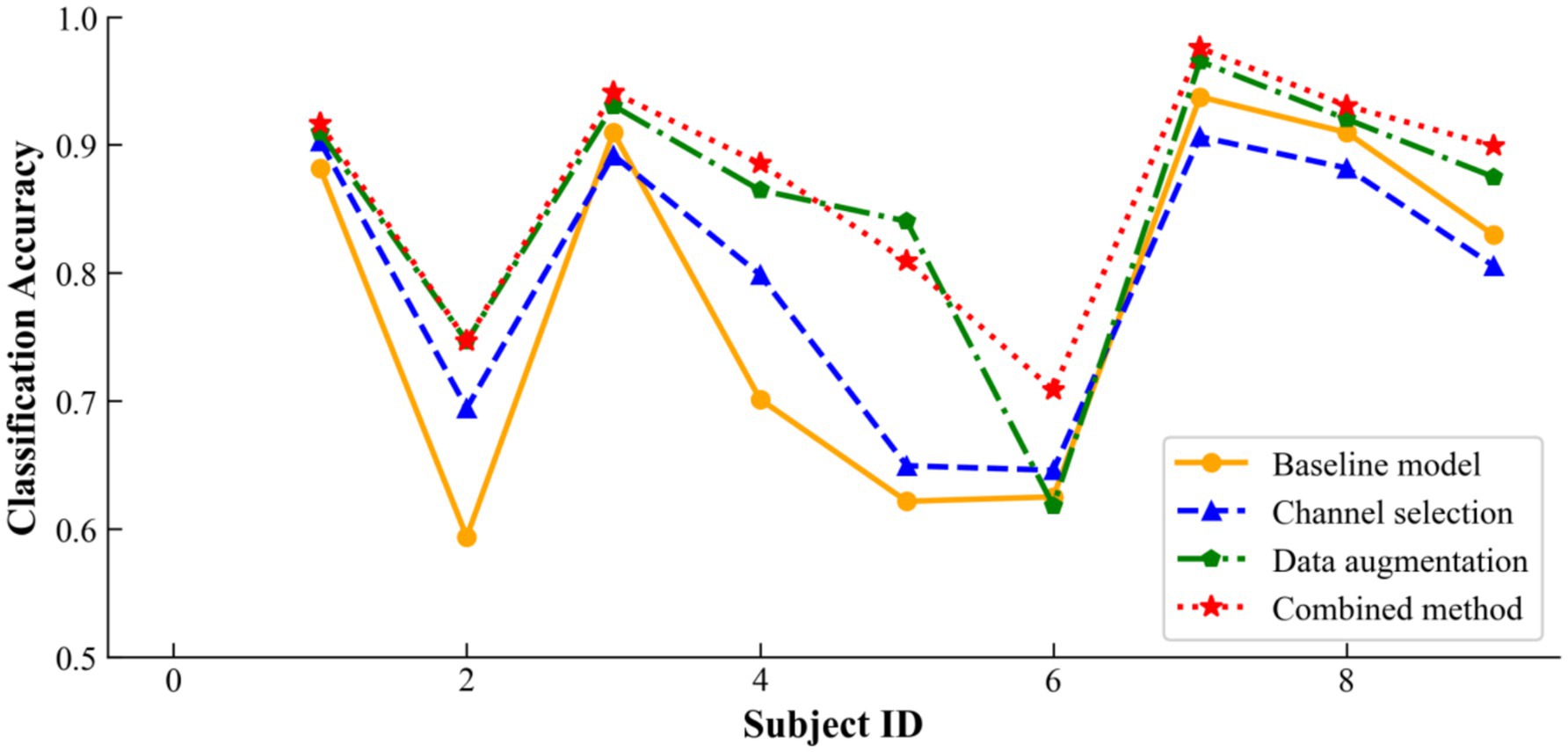 The data presented in Table 4 highlights the incremental benefits of each component in our methodology. The addition of the channel selection module alone improved the average accuracy by 1.74%, indicating its role in enhancing feature discriminability. The data augmentation component further elevated the average accuracy by 7.33%, demonstrating its effectiveness in enriching the dataset and mitigating overfitting. Most significantly, the combined approach achieved an 8.92% increase in accuracy over the baseline model, affirming the synergistic advantages of integrating both techniques. These results validate our approach’s ability to substantially enhance EEG signal classification accuracy. As shown in the table, the proposed data-augmentation method boosts the baseline accuracy by 7.33%, a marked improvement that confirms its ability to effectively blend the two temporal windows provided by the preprocessing stage and to generate physiologically plausible synthetic EEG signals. Compared with the 1.74% gain achieved by channel selection alone, this enhancement underscores the greater importance of data augmentation for improving classification accuracy.