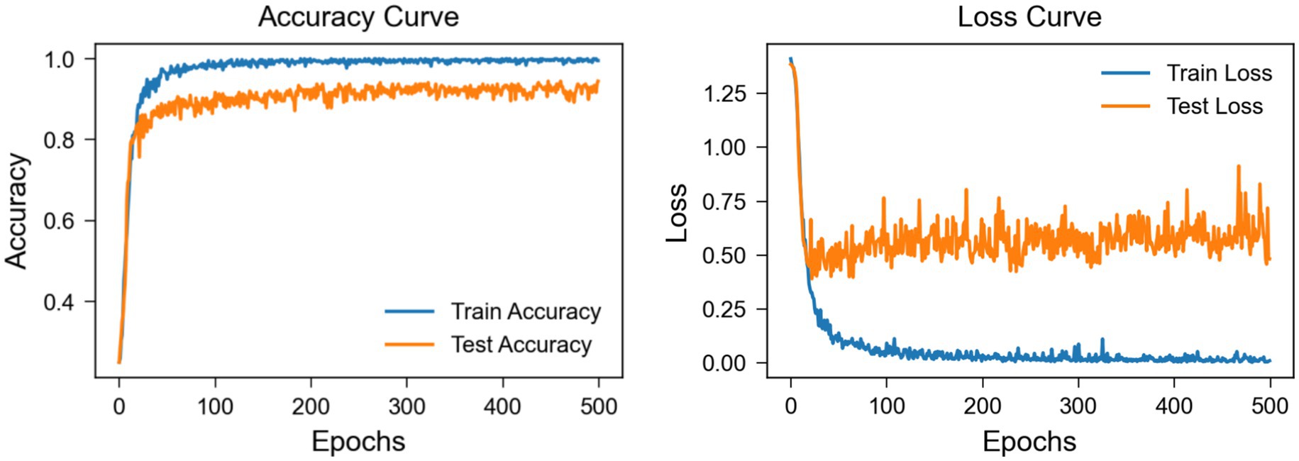 The learning curve graph from Figure 11, based on Subject 3 of the BCI Competition IV 2a dataset, reveals discrepancies between training and testing performance metrics. The training accuracy quickly approaches 100%, while the testing accuracy stabilizes at around 88%, suggesting the potential presence of overfitting. Additionally, the training loss decreases to near zero, yet the testing loss exhibits significant fluctuations and remains relatively high, further indicating a generalization gap. These results underscore the necessity for strategies to mitigate overfitting. In subsequent work, our approach will further refine the model to enhance its robustness and generalization capabilities on unseen data.