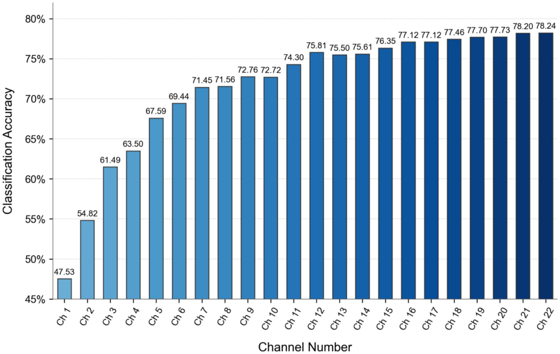 As shown in Figure 13, classification accuracy generally improves with increasing channel count until the top 12 channels. Beyond this point, accuracy temporarily decreases when selecting the top 13 and 14 channels, indicating channel redundancy in the middle section of the sequence. Referencing the conventional 16-channel configuration from Common Spatial Pattern (CSP) spatial filtering, we set the channel selection hyperparameter n = 16. This configuration combines the top 12 channels with the last four channels of the sequence (indices 0, 7, 21, 6), deliberately bypassing intermediate channels to avoid redundancy.