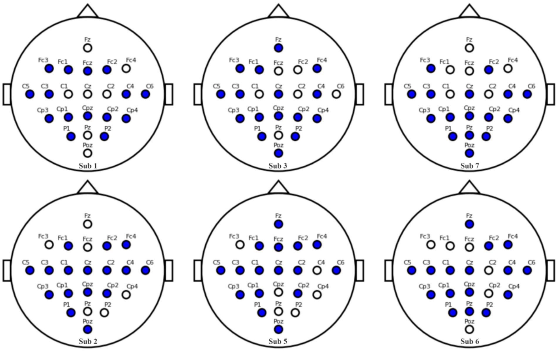 Based on the positions of the EEG electrodes, predefined pairs of symmetric electrodes, such as C3/C4, FC1/FC2, etc., are established. After calculating the wavelet packet entropy and obtaining the sequence of channels, the first n channels are selected (it is later verified that n = 12). Then, following the principle of electrode pairing, the process starts from the end of the channel sequence and works backward to match symmetrically until symmetry is achieved, thus completing the channel selection.
