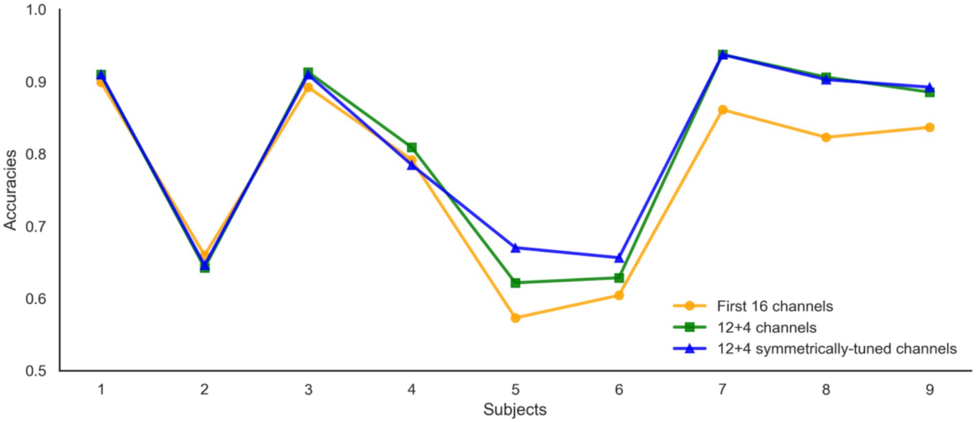 Figure 15 illustrates the impact of channel configuration on classification accuracy across different subjects. The graph compares the performance of three different channel selection strategies: using the first 16 channels, a 12 + 4 channel configuration, and a 12 + 4 configuration with symmetrically-tuned channels. It is evident that the 12 + 4 symmetrically-tuned channels consistently outperform the other two strategies, particularly for Subjects 5 and 6, where accuracy saw a significant boost. This suggests that enhancing channel symmetry through strategic supplementation of 1–3 channels can substantially improve classification performance. The findings underscore the importance of considering the spatial arrangement of channels in EEG-based classification systems. Future research will focus on further investigating the relationship between channel symmetry and classification performance to optimize EEG signal interpretation and enhance the reliability of brain–computer interfaces.