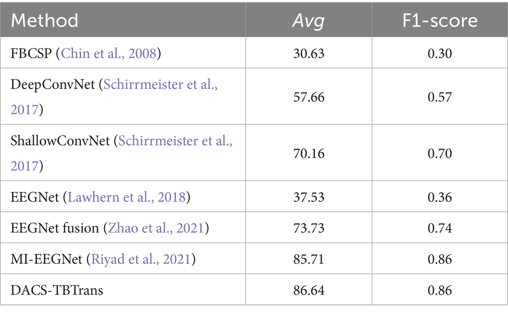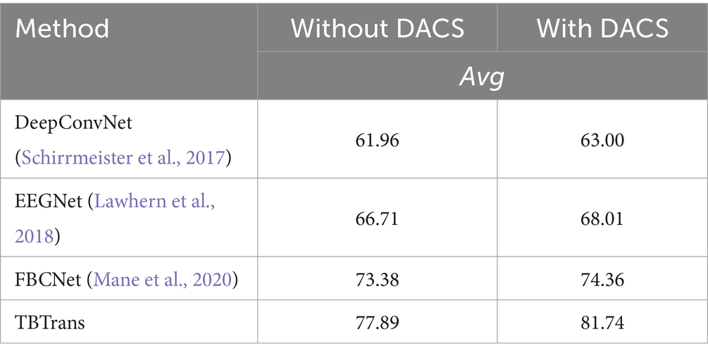 The proposed DACS-TBTrans method was evaluated on two four-class motor imagery datasets: the BCI Competition IV Dataset 2a and the Physionet MI Dataset. Experimental results were compared against multiple state-of-the-art baseline methods, with statistical significance assessed using paired t-tests.