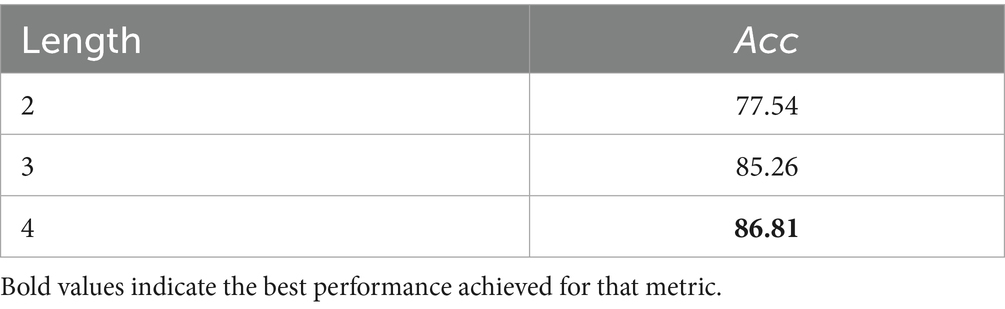 Accuracy (Acc) quantifies the proportion of correctly predicted samples relative to the total sample size. In Equation 7, TP denotes True Positives, TN denotes True Negatives, FP denotes False Positives, and FN denotes False Negatives. The value of Accuracy falls within the range [0, 1], where values closer to 1 correspond to superior model performance.