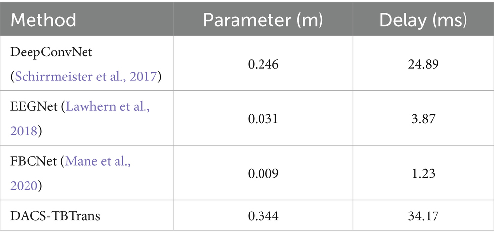 We conducted systematic experiments on window length using the BCI Competition IV-2a dataset and evaluated the proposed model under different temporal windows; the results are summarized in Table 6. It can be seen that the model achieves the highest classification accuracy with a 4-s window. Table 7 further reports the parameter count and inference latency, showing that the proposed model is comparable to classic deep-learning architectures such as DeepConvNet in terms of model size, and that both the number of parameters and the latency remain within acceptable limits.