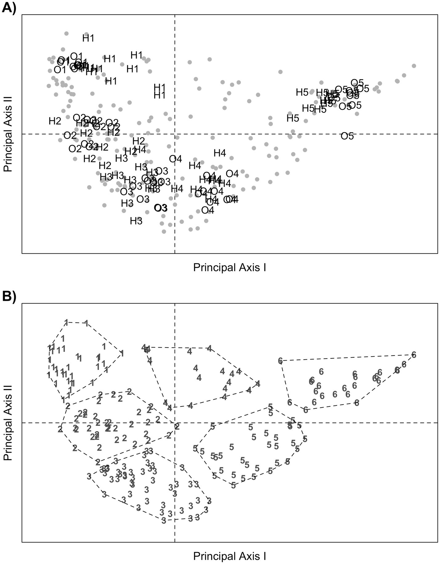 MCA biplots showing the relationships among TD-fNIRS amplitudes. Panel A: Eyes are represented by gray points; fNIRS amplitudes, classified in five classes according to their magnitude, are represented by the labels: O1 to O5 (O2Hb component) and H1 to H5 (HHb component). The label O1 represent the values closest to 0 μM; the following labels (O2-O5) represent values gradually more distant from 0 μM. The same holds for the labels H1 to H5. Panel B: Eyes are represented with numbers from 1 to 6, according to the pertinent cluster membership. The points belonging to the same clusters are delimited by dashed polygons, so that to provide a clear visualization of the clusters in the figure.
