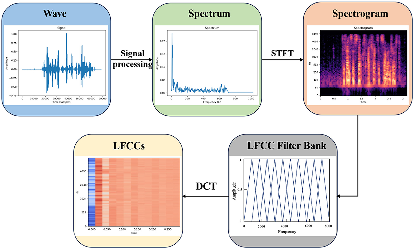 LFCC have achieved standout performance in Voice Authenticity Verification, serving as the baseline system features in the ASVspoof2019 Challenge. The extraction process of LFCC is shown in Figure 2, the audio signal is first converted from the time domain to the frequency domain by signal processing to obtain the spectrum, and the spectrogram implying the time-frequency feature is obtained by Fast Fourier Transform, and then LFCC is obtained by LFCC filter bank. The computation of these linear coefficients utilizes a linear filterbank that offers improved frequency resolution at higher bands. The LFCC filter bank expression is as follows: