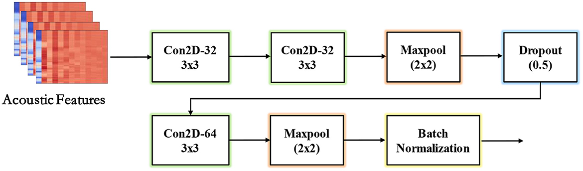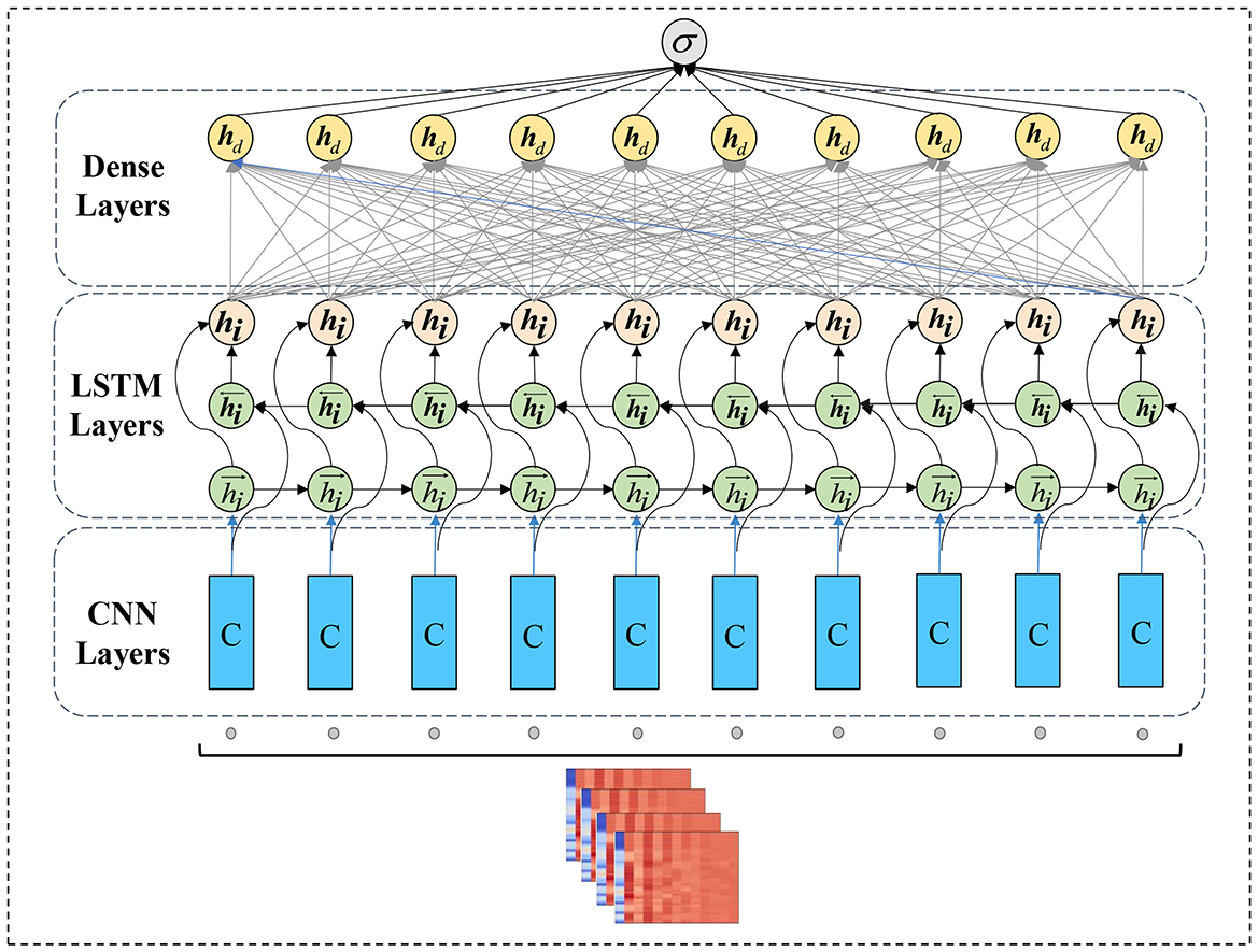 Convolutional neural networks (CNNs) are a class of feedforward neural networks widely used in domains such as face detection, speech recognition, and activity recognition (Jin et al., 2022, 2024). Standard CNNs consist of convolutional layers, pooling layers, fully connected layers and activation functions. Convolutional layers contain trainable filters to extract features from input data. Pooling layers enhance translation invariance by reducing the spatial resolution of feature maps. Fully connected layers act as classifiers, while common activation functions include Sigmoid, Tanh, and ReLU. Figure 4 depicts the basic architecture of our CNN structure, which computations can be expressed as equation: