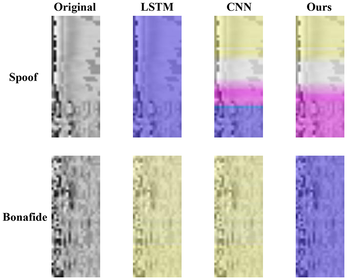 The CNN model primarily targets low-frequency regions where energy concentrations are strongest, effectively capturing basic spectral patterns but showing limited sensitivity to temporal dynamics. In contrast, the LSTM model focuses on temporal anomalies within the sequence but lacks responsiveness to spatial features such as high-frequency artifacts. Notably, the CNN–LSTM model, by integrating convolutional spatial feature extraction with recurrent temporal modeling, exhibits a balanced attention pattern: it highlights stable mid-to-low frequency regions in genuine speech, while accurately identifying high-frequency anomalies and spectral discontinuities in deepfake samples.
