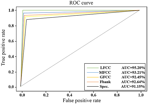 Figure 8 depicts the ROC curves for five types of features on the CNN-LSTM model, providing a visual representation of their respective AUC values. It is observed that the area under the ROC curve is largest for LFCC features, followed by MFCC, Fbank, GFCC, and Spectrogram, indicating their descending order of performance in terms of AUC. This visual representation reaffirms that LFCC features exhibit the highest discrimination ability between authentic and synthetic speech, making them the most effective for tasks requiring precise authenticity verification in audio signals.