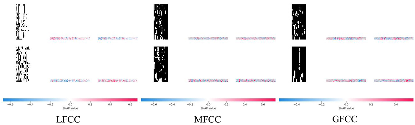 To further elucidate the contributions of different acoustic features to model decisions, we conducted a SHAP (SHapley Additive Explanations) analysis for MFCC, LFCC, and GFCC features shown in Figure 9.