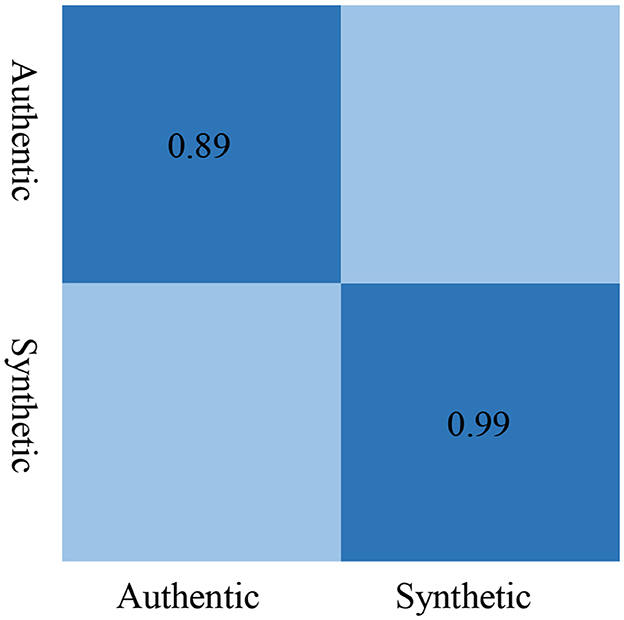 We used a confusion matrix Figure 10 to provide a more intuitive view of the F1-Score metrics. It is observed that when using LFCC features, the F1 Score for detecting authentic speech is 0.89, and for detecting synthetic speech is 0.99, which is the highest among the three types of features.