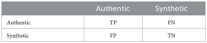 In this paper we use F1 score, EER, and AUC as evaluation metrics. For binary classification algorithms, the detection results of the algorithm are categorized into four classes based on the combination of predicted values and actual values: true positives (TP), false positives (FP), true negatives (TN), and false negatives (FN). All possible outcomes are presented in the form of a confusion matrix, as shown in Table 3.