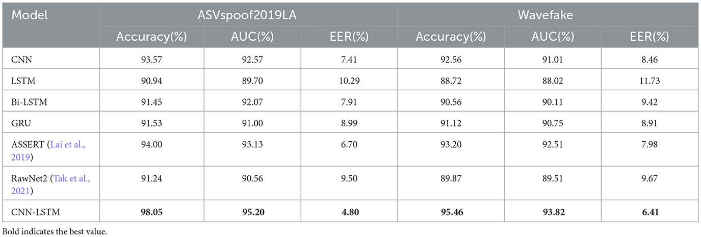 Although all models experience a small decline in performance when transitioning from ASVspoof2019-LA to WaveFake (for in-stance, CNN–LSTM's accuracy decreases by 2.6%, and its EER rises by 1.6%), the relative rankings remain stable, underlining the robustness and adaptability of the CNN–LSTM model across datasets. These results confirm that integrating convolutional feature extraction with recurrent temporal modeling is crucial for achieving both high detection accuracy and resilience across different deepfake audio scenarios.