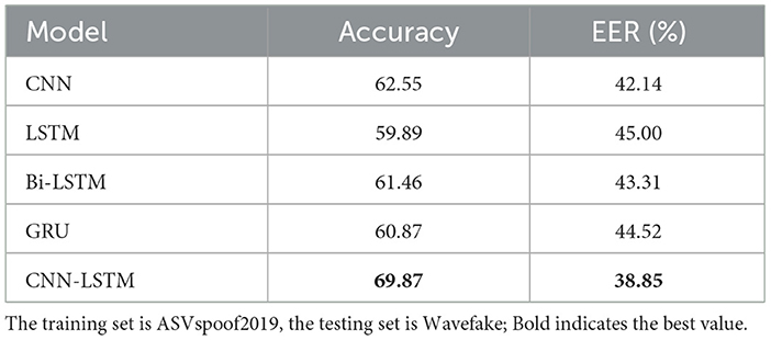 The cross-domain validation experiment results shown in Table 6, all models exhibited varying degrees of performance degradation compared to their results on single-dataset evaluations, highlighting the challenges posed by unseen spoofing types to model generalization. Specifically, the CNN–LSTM model achieved the highest accuracy (69.87%) and the lowest EER (38.85%), significantly outperforming the other models. This indicates that the hybrid architecture, which combines convolutional feature extraction with recurrent temporal modeling, effectively captures cross-dataset commonalities in deepfake audio and offers strong transferability. In contrast, standalone CNN and recurrent neural networks (LSTM, Bi-LSTM, GRU) showed similar performance, with accuracies ranging from 59.89% to 62.55% and relatively high EERs (42.14% to 45.00%), suggesting that single-mode feature extraction is insufficient for complex cross-domain detection tasks. Moreover, while the Bi-LSTM demonstrated slight improvements over the unidirectional LSTM in both accuracy and EER, the gains were limited. These findings further validate the importance of composite feature modeling strategies in enhancing the robustness of speech authentic detection systems. Overall, the results demonstrate that the CNN–LSTM architecture provides superior generalization when confronted with previously unseen spoofing types, making it a strong candidate for complex audio forgery detection tasks.