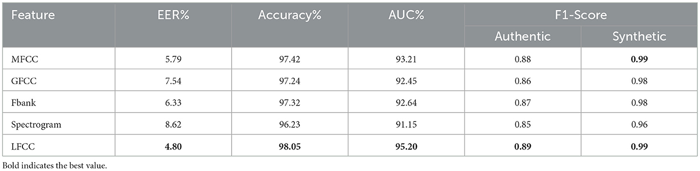 In the experimental setup, we varied the acoustic features while keeping all other variables constant to ensure a fair comparison. The results, as summarized in Table 7, are evaluated using key performance metrics such as EER%, Accuracy%, AUC%, and F1-Score for both authentic and synthetic speech data.