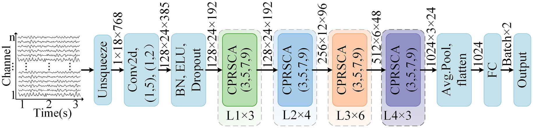 Figure 1. The architecture of the proposed CPRSCA-ResNet network, illustrated using 18-channel EEG signals from the CHB-MIT dataset as an example. The input EEG signals have a dimension of (18 × 768). After the Unsqueeze operation, the data are reshaped to (1 × 18 × 768), corresponding to (C × H × W). Subsequent convolutional operations are then applied, where (1, 5) and (1, 2) denote the kernel size and stride, respectively. The notation ‘L1 × 3’ indicates that the module named L1 is repeated three times, with similar conventions applied to the other layers.