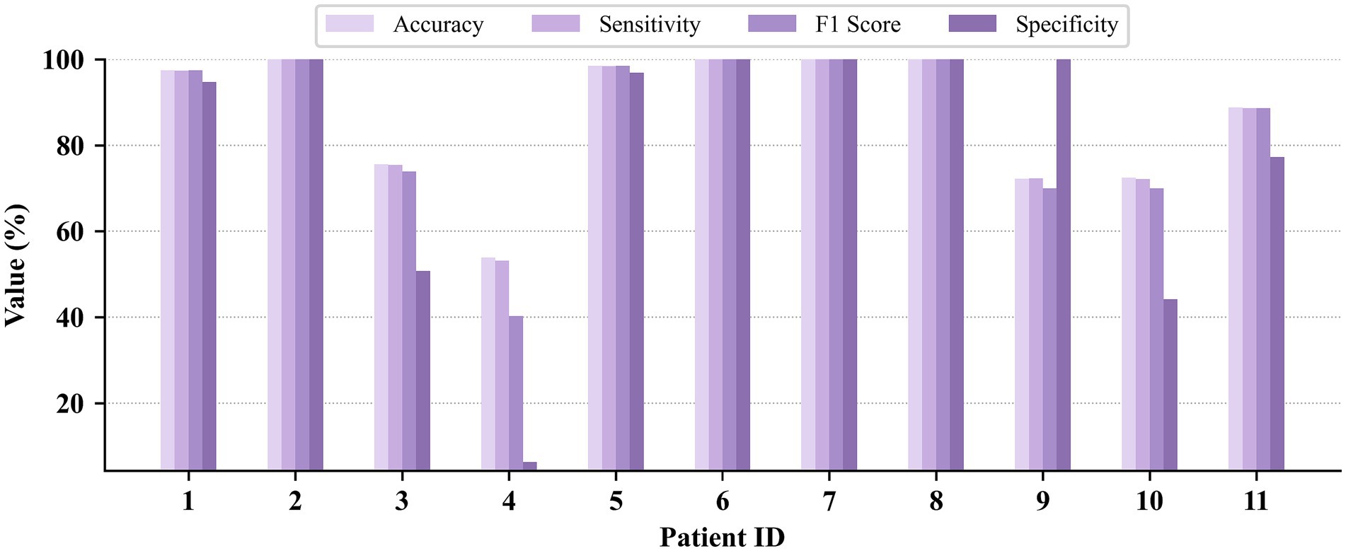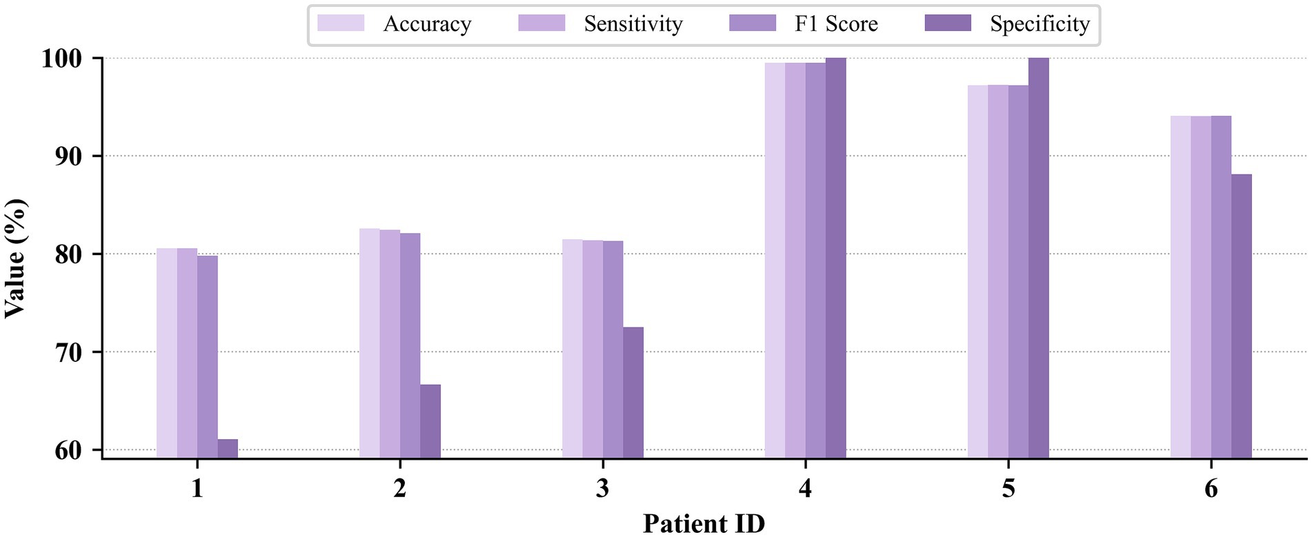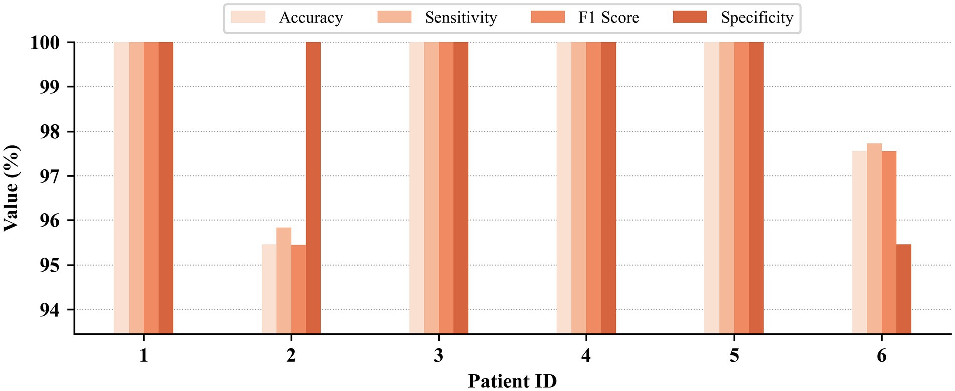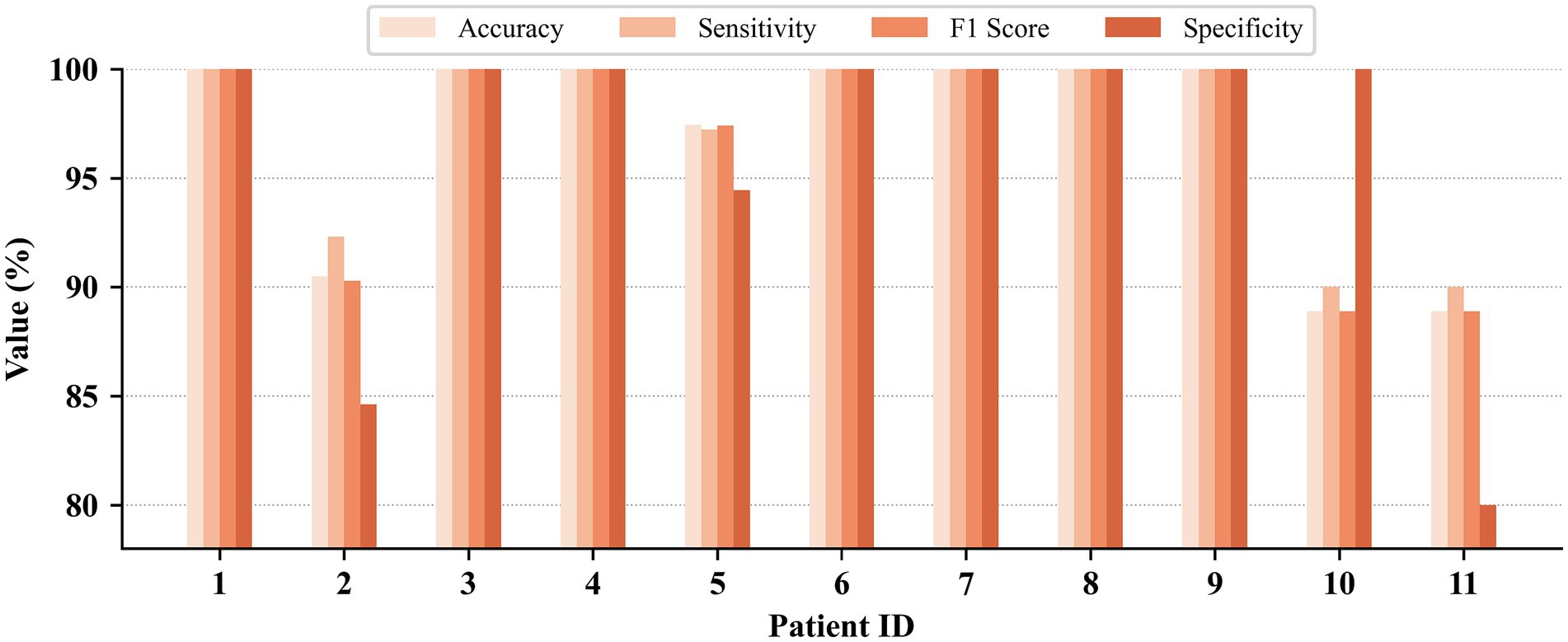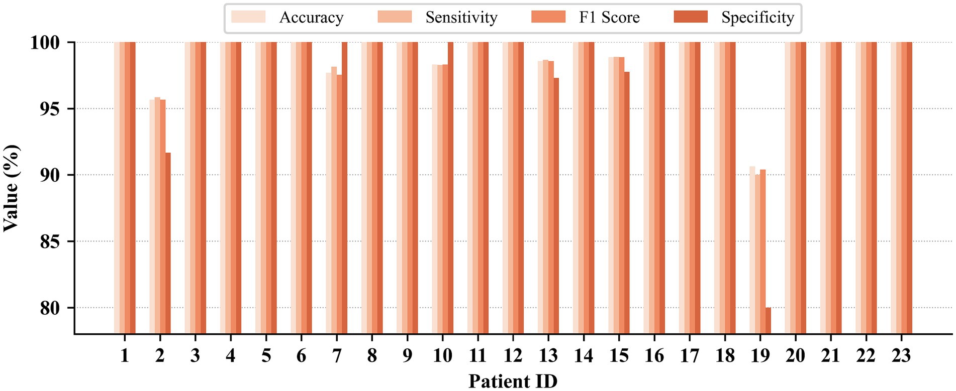 Patient-dependent seizure detection results on the CHB-MIT, JHMCHH, and JHCH datasets are presented in Figures 3–5, respectively. On the CHB-MIT dataset, the performance for Accuracy, Sensitivity, F1 Score, and Specificity was observed to be 99.12 ± 2.09%, 99.12 ± 2.18%, 99.10 ± 2.14%, and 98.55 ± 4.34%, respectively. On the JHMCHH dataset, the corresponding metrics were 96.88 ± 4.64%, 97.23 ± 4.07%, 96.86 ± 4.67%, and 96.28 ± 6.84%. On the JHCH dataset, the performance for these four metrics reached 98.84 ± 1.75%, 98.93 ± 1.61%, 98.83 ± 1.76%, and 99.24 ± 1.69%, respectively. It should be noted that lower scores in some patients may be attributed to relatively short seizure durations in EEG recordings and the presence of considerable noise in the data.