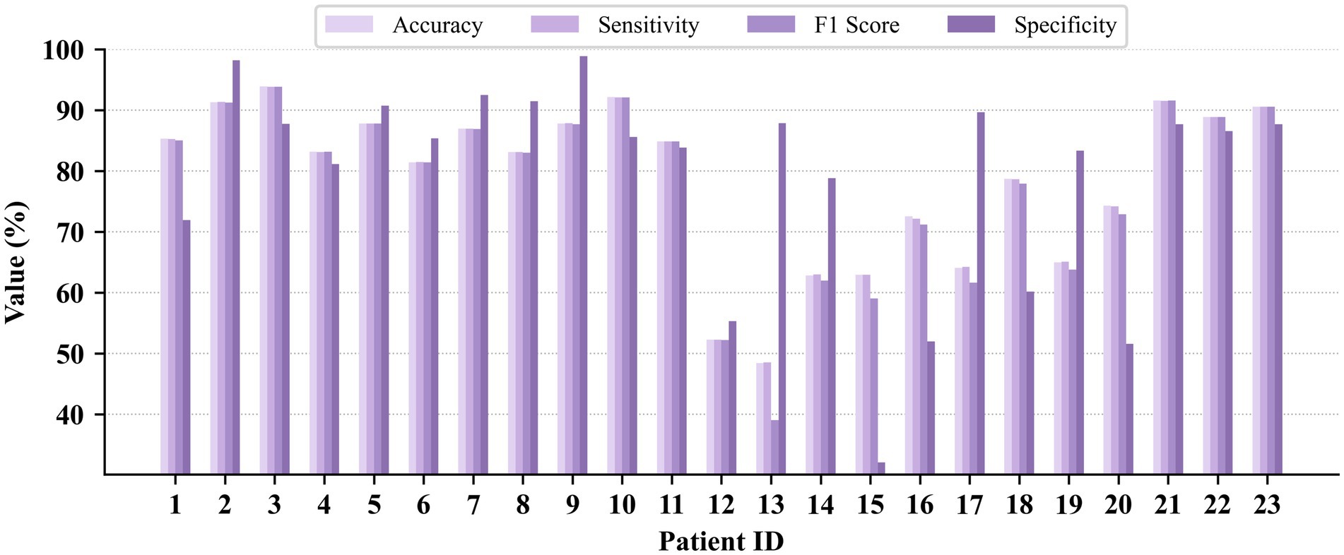 The proposed algorithm was implemented using the PyTorch deep learning framework (version 1.12). Experiments were conducted on a platform equipped with an NVIDIA GeForce RTX 3080Ti GPU (12GB VRAM) and running Windows 11. During training, a batch size of 4 was employed, and the total number of epochs was set to 50. The cross-entropy loss function was utilized, and parameter optimization was carried out using the AdamW optimizer. To enhance the training process, a dynamic learning rate adjustment strategy was adopted: the learning rate was initially set to 5 × 10−4 with a warm-up phase, wherein the learning rate was rapidly increased to its target value at the beginning of training, followed by a gradual decay according to a predetermined schedule. This adaptive adjustment facilitated faster convergence of model parameters toward an optimal solution in the early stages while ensuring training stability through refined learning rate decay in later stages. In terms of data partitioning, two experimental schemes were designed, namely patient-dependent and patient-independent. In the patient-dependent setting, the data of each patient were randomly divided into training and testing sets according to a 4:1 ratio, with approximately 80% of the data used for training and the remaining 20% used for testing, so as to evaluate the detection performance within the same patient. In the patient-independent setting, patient identities were strictly separated, and the Leave-One-Subject-Out strategy was adopted. Specifically, in each experiment, the entire data of one patient were designated as the testing set, while the data of all other patients were used as the training set. This procedure was iteratively rotated until every patient had served once as the testing subject, thereby providing a comprehensive evaluation of the robustness and generalization ability of the model in cross-patient scenarios. Model performance was assessed using several evaluation metrics, including accuracy, sensitivity, F1 score, and specificity, with the calculation formulas provided as Equations 13–16: