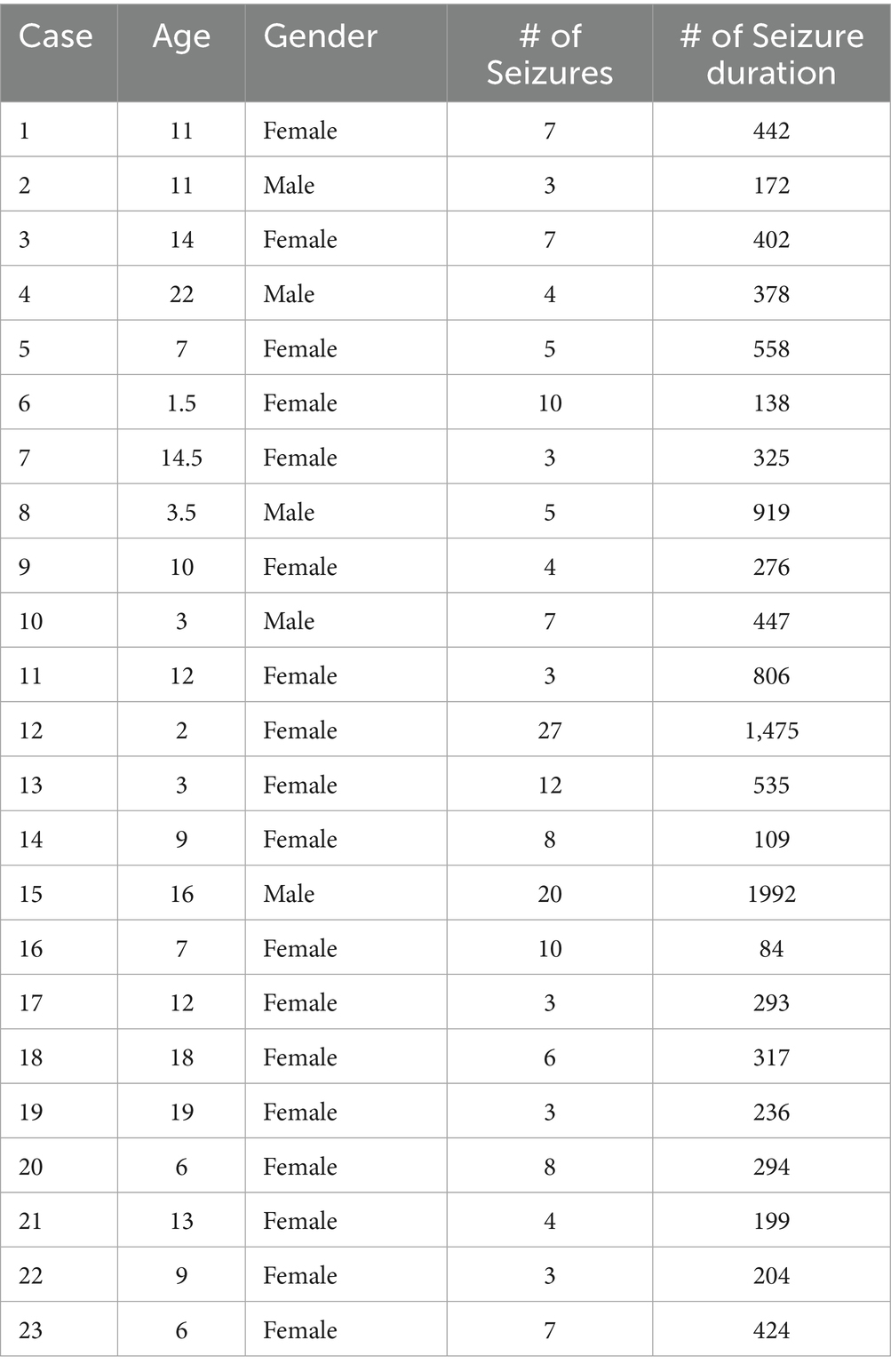 The CHB-MIT public dataset was obtained from Boston Children’s Hospital (Goldberger et al., 2000), comprising 23 EEG recordings from 22 patients with refractory epilepsy (5 males, aged 3–22 years; 17 females, aged 1.5–19 years). A total of 916 h of data were recorded, documenting 198 seizure events. The signals were acquired using the international 10–20 electrode placement system, sampled at 256 Hz with 16-bit resolution. Following the recommendations of Tsiouris et al., 18 channels consistently present across all cases were selected for analysis to reduce heterogeneity (Tsiouris et al., 2018): FP1-F7, F7-T7, T7-P7, P7-O1, FP1-F3, F3-C3, C3-P3, P3-O1, FZ-CZ, CZ-PZ, FP2-F4, F4-C4, C4-P4, P4-O2, FP2-F8, F8-T8, P8-O2, and T8-P8. Details of the patients are summarized in Table 1.