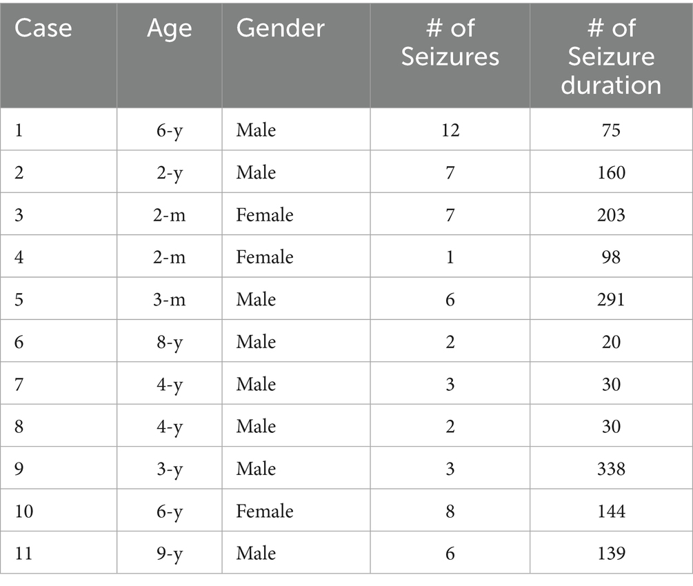 The JHMCHH dataset was newly collected at Jinhua Maternal and Child Health Hospital, including 24-h EEG recordings from 11 pediatric epilepsy patients, documenting a total of 57 seizures. Patient ages ranged from 2 months to 9 years. Patient details are summarized in Table 3.