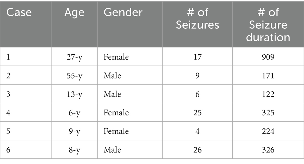The JHCH dataset was newly collected at Jinhua Central Hospital, consisting of 24-h EEG recordings from six pediatric and neurology department patients with epilepsy. Of these, four were from the pediatric department and two from neurology, with a total of 87 recorded seizures. Patient ages ranged from 6 to 55 years. Patient details are summarized in Table 2.