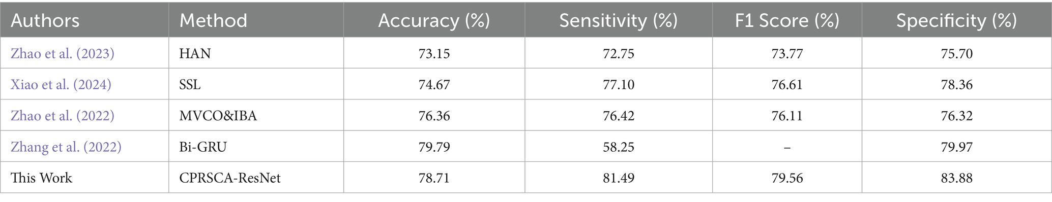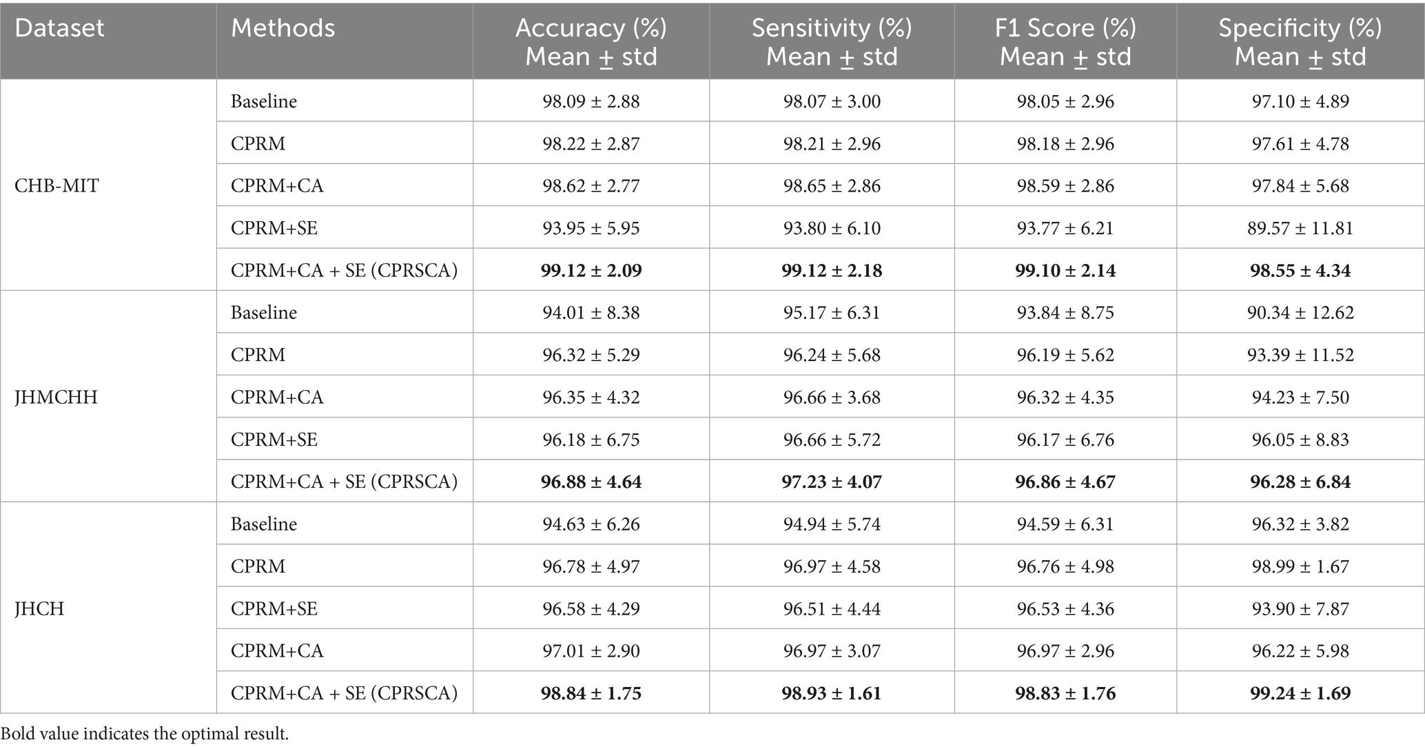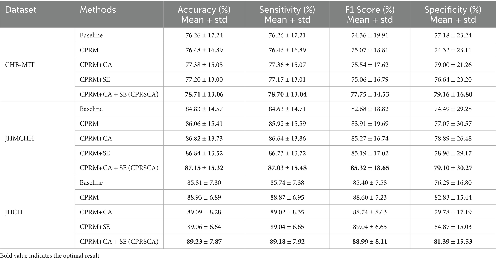 Ablation experiments for patient-independent seizure detection were first conducted to assess the performance of the CPRSCA model, as presented in Table 5. The multi-scale module was initially adopted as the baseline model, followed by an evaluation of the classification performance when combined with CA, SE, and their combination. Further assessments were carried out by integrating the CPRM module with CA and SE individually, as well as by incorporating multi-scale techniques together with CA and SE, and the results were compared with those of the multi-scale module. As observed in Table 5, the integration of the CPRM module with the two distinct attention mechanisms resulted in a further improvement in accuracy, indicating that the complementary effects among these modules collectively enhance patient-independent seizure detection performance.