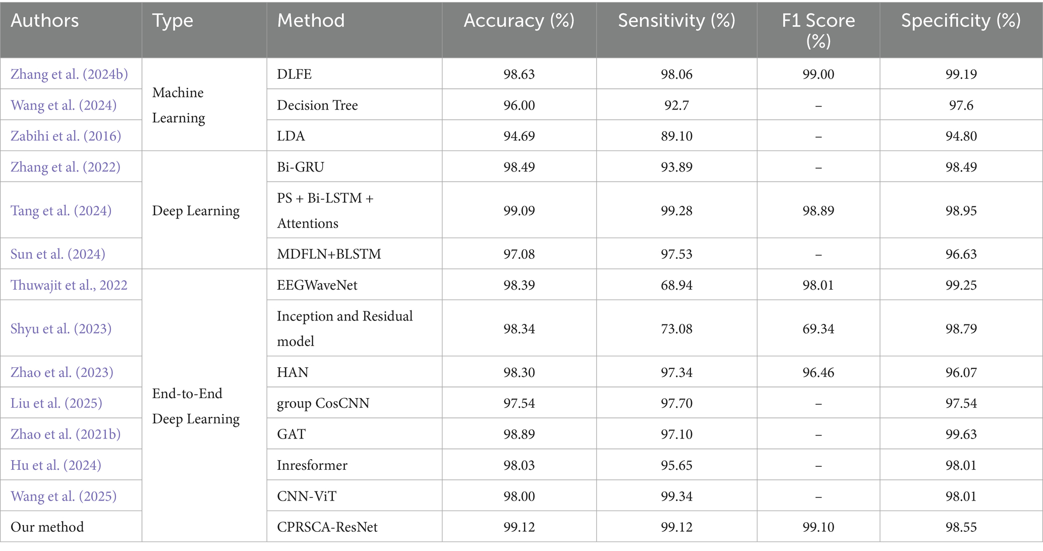Table 6. Comparison of patient-dependent seizure detection results between the proposed method and other research methods on the CHB-MIT dataset.