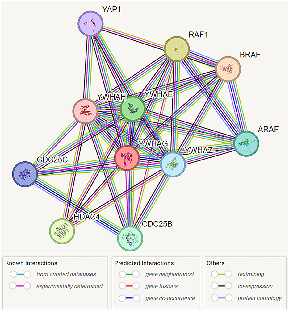 Figure 1. Functional interaction network of 14-3-3γ encoded by YWHAG. Network nodes are labeled with the name of the individual genes which encode the represented proteins. Protein interactions are represented by color coded lines, based on known and predicted interactions, as indicated by the legend. Source: https://stringdb.org/cgi/network?taskId=bMYGzw1kOtuv&sessionId=bMliKFIeKj5g. Screenshot image obtained from the STRING database (string-db.org). Licensed under the Creative Commons Attribution 4.0 International License (CC BY 4.0).