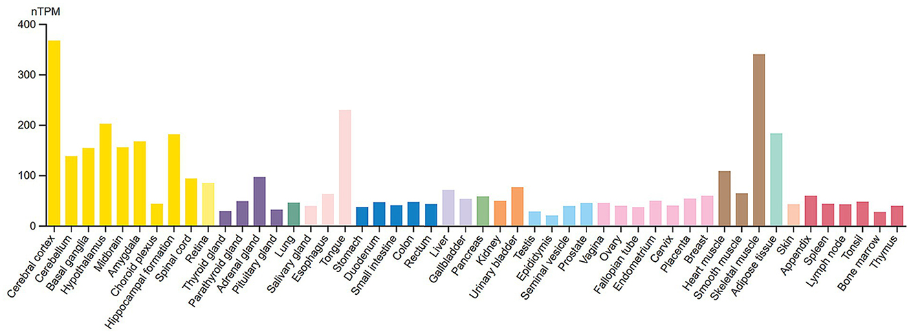 Figure 2. RNA tissue specificity expression of 14-3-3γ. Normalized RNA expression levels (nTPM) shown for 55 tissue types. Color coding is based on tissue groups, each consisting of tissues with functional features in common. RNA tissue specificity expression is enhanced in brain (yellow bars) and skeletal muscle cells (brown bars). Source: https://www.proteinatlas.org/ENSG00000170027-YWHAG/tissue. Screenshot image obtained from the Human Protein Atlas (proteinatlas.org). Licensed under the Creative Commons Attribution-ShareAlike 4.0 International License (CC BY-SA 4.0).