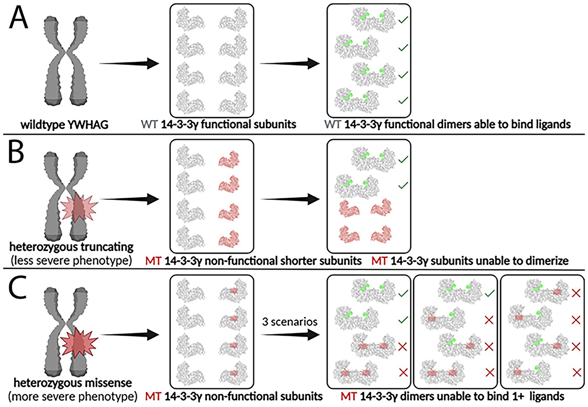 Figure 6. Impact of heterozygous truncating and missense YWHAG mutations on 14-3-3γ dimer formation and function. (A) The wildtype YWHAG gene produces normal 14-3-3γ subunits, which assemble into functional 14-3-3γ dimers, able to bind phosphorylated ligands. (B) A truncating mutation produces non-functional mutant 14-3-3γ subunits that are shorter and smaller, which are unable to dimerize and to bind phosphorylated ligands. (C) A missense mutation produces non-functional mutant 14-3-3γ subunits that are the same size as the wildtype subunits, which are able to dimerize but unable to bind two phosphorylated ligands. WT, wildtype; MT, mutant. Created in Biorender.