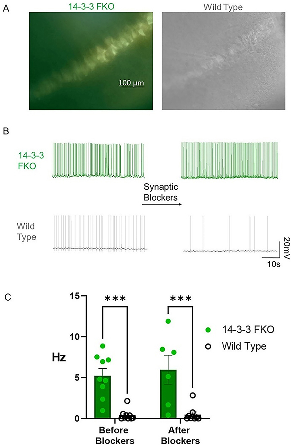 Figure 7. 14-3-3 FKO hippocampal CA1 neurons fire more APs than WT neurons in the presence and absence of synaptic blockers. (A) Hippocampal slice images captured using phase contrast and fluorescence microscopy show 14-3-3 FKO neurons (left) identified by their YFP fluorescence, indicating difopein expression. (B) Traces of spontaneous AP firing in 14-3-3 FKO and WT neurons under whole-cell configuration, before and after synaptic blocker application. (C) Group data showing a higher AP firing rate for 14-3-3 FKO cells (n = 9 before blockers, 6 after blockers) than WT cells (n = 9 before blockers, 8 after blockers). AP, action potential; FKO, functional knockout; WT, wildtype; CA1, one of four hippocampal subfields that make up hippocampus structure. Source: Figure 1 from Logue et al. (2024).