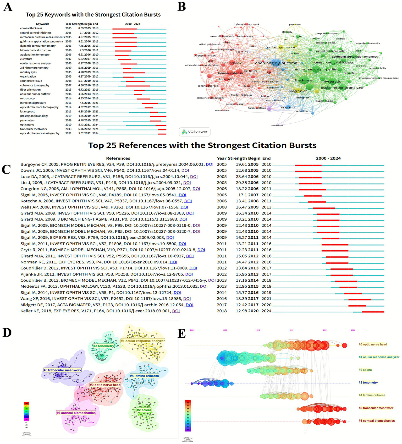 The bibliometric analysis of keywords and references. (A) Top 25 keywords with the strongest citation bursts in glaucoma biomechanics. (B) The co-occurrence analysis of keywords. The size of each node refers to the frequency of the keywords, and the links connecting two nodes represent a co-occurrence relationship between two keywords. (C) Top 25 references with the strongest citation bursts in glaucoma biomechanics. (D) Citespace visualization clusters of co-citations in glaucoma biomechanics. (E) Timeline views of clusters of co-cited references about glaucoma biomechanics studies. The X-axis represents the year, and the Y-axis displays the name of each cluster.