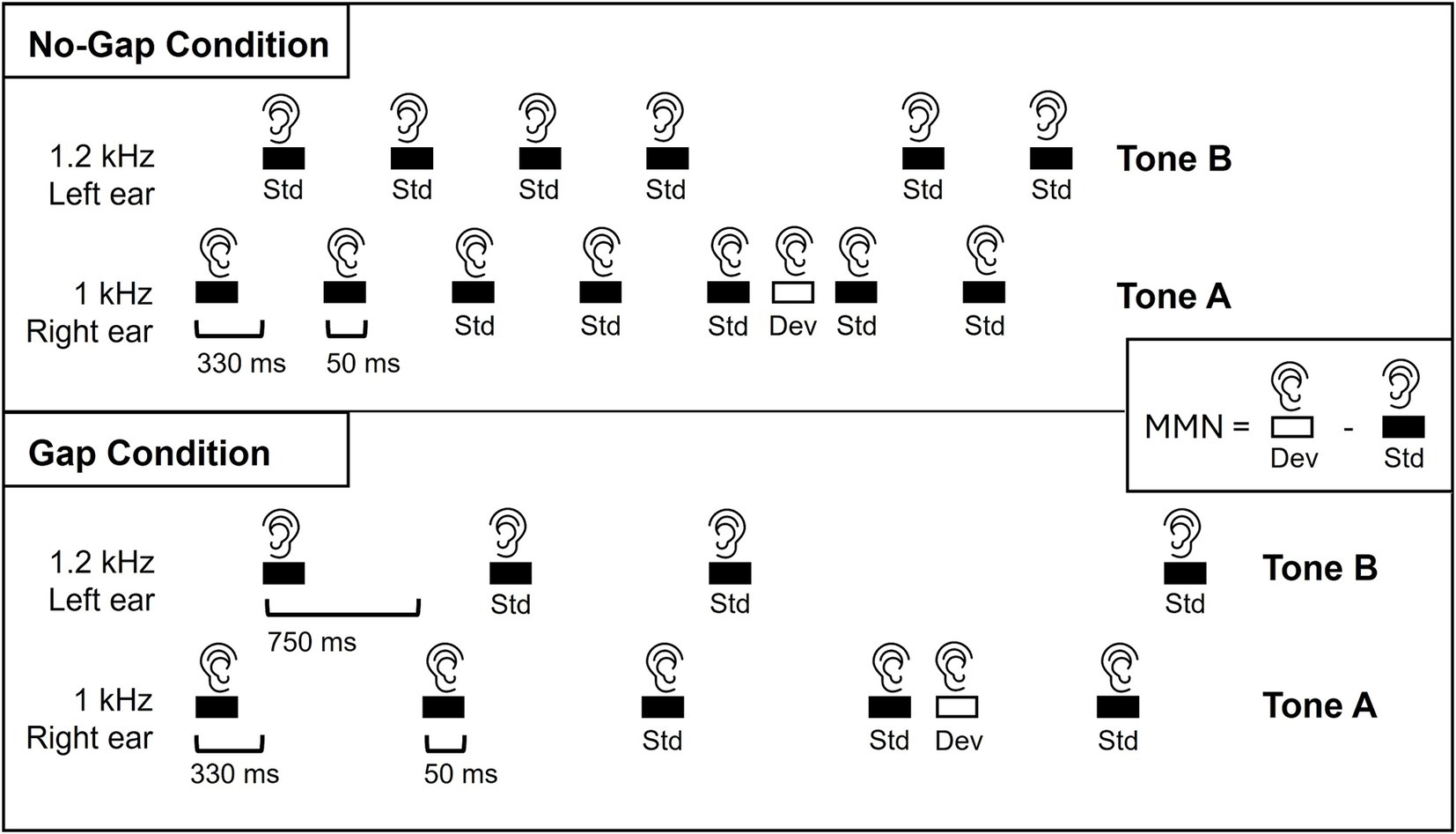 Figure 1. Example of the auditory stimulation sequence. Stimuli were 50-ms binaural tones presented in alternating pairs. Tone A (1 kHz) was biased to the right ear (80 dB right, 65 dB left), and Tone B (1.2 kHz) was biased to the left ear (80 dB left, 65 dB right). Standard pairs (A-B, 85.6%) were presented along with occasional deviant pairs (A-A, 14.3%). Two presentation modes were used: a No-Gap condition, where pairs followed continuously with a 330 ms SOA, and a Gap condition, where pairs were separated by 750 ms. Dual-rule MMN was derived by subtracting the response to standards (Tone B in A-B pairs) from the response to deviants (repeated Tone A in A-A pairs).