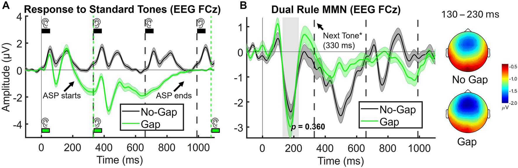Figure 2. Grand-average waveforms (n = 30) at FCz (EEG). (A) Illustration of the Auditory Segmentation Potential (ASP) in the Gap condition, elicited by standard tones in the dual-rule paradigm. Black squares indicate tone sequences in the No-Gap condition, and green squares indicate sequences in the Gap condition, where a 750-ms SOA was inserted between tone pairs. Tones alternated in spatial location and in frequency (1 kHz vs. 1.2 kHz, not depicted). (B) Dual-rule MMN derived by subtracting responses to standards (Tone B) from deviants (repeated Tone A). The shaded gray rectangle marks the analysis window (130–230 ms). Corresponding scalp topographies for the dual-rule MMN are shown for each condition. Shaded areas indicate the standard error of the mean (SEM). * Arrow marks the next tone in the sequence, which occurs only in the No-Gap condition.