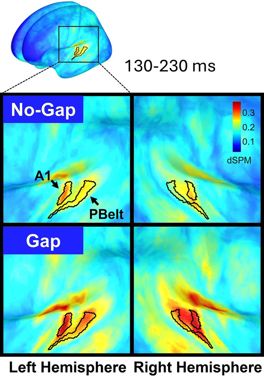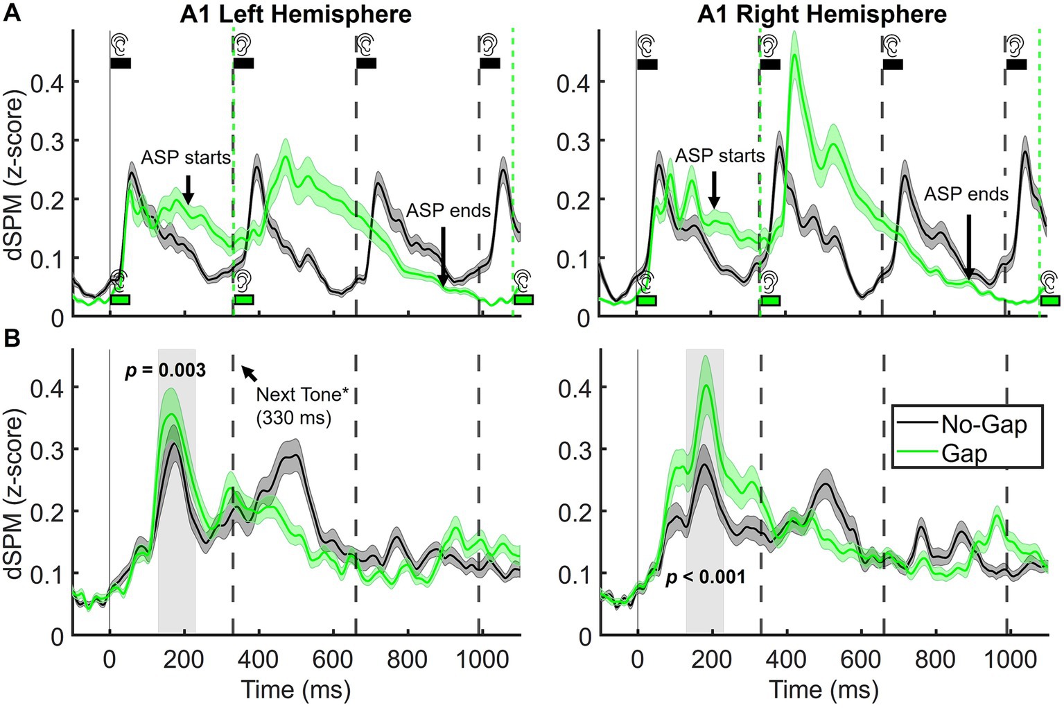 Figure 3A shows source-level waveforms in bilateral A1 elicited by standard stimuli in both experimental conditions. Visual inspection of the waveforms suggests that individual evoked responses to each tone are present in the No-Gap condition. In the Gap condition, responses to individual tones overlapped with a slow-wave potential extending across the gap between tone pairs (approximately 200–1,080 ms, as also seen in the EEG), likely reflecting ASP in the source domain (not previously reported). This response also appeared more pronounced over the right hemisphere, although statistical tests were conducted only for MMN.