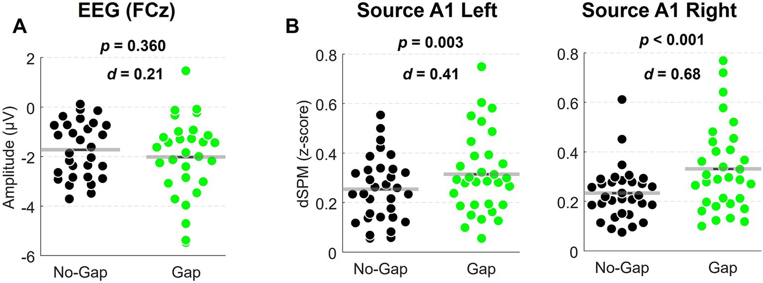 Figure 4. Scatter plots of dual-rule MMN mean amplitudes at EEG FCz (A) and at left and right A1 MEG sources (B). For each plot, p values from paired-samples t-tests (EEG) or Bonferroni-corrected pairwise comparisons (MEG) are shown, along with Cohen’s d effect sizes. Significant differences between No-Gap and Gap conditions were observed only for A1 MEG sources.
