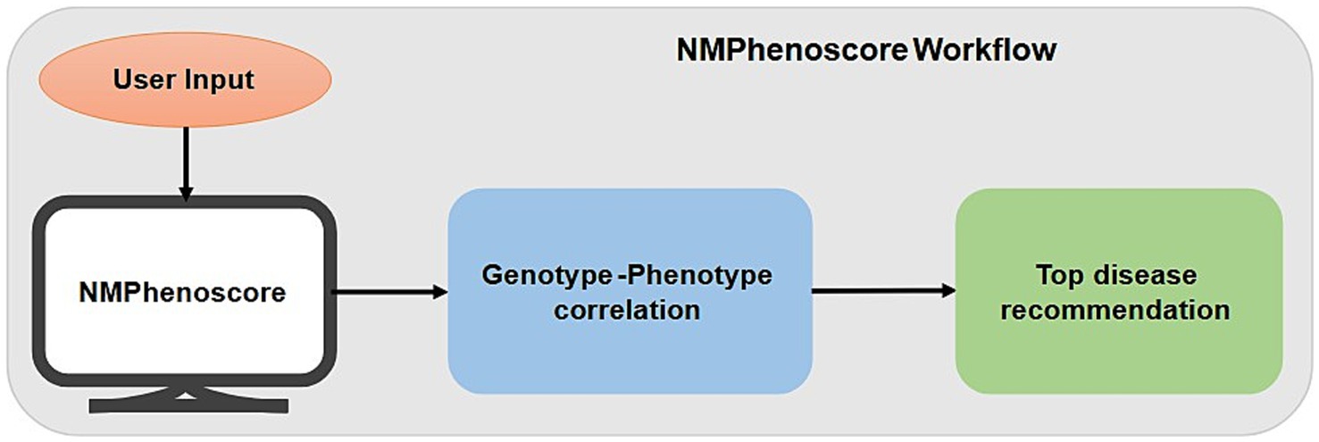 NMPhenoscore Workflow diagram. An orange oval labeled