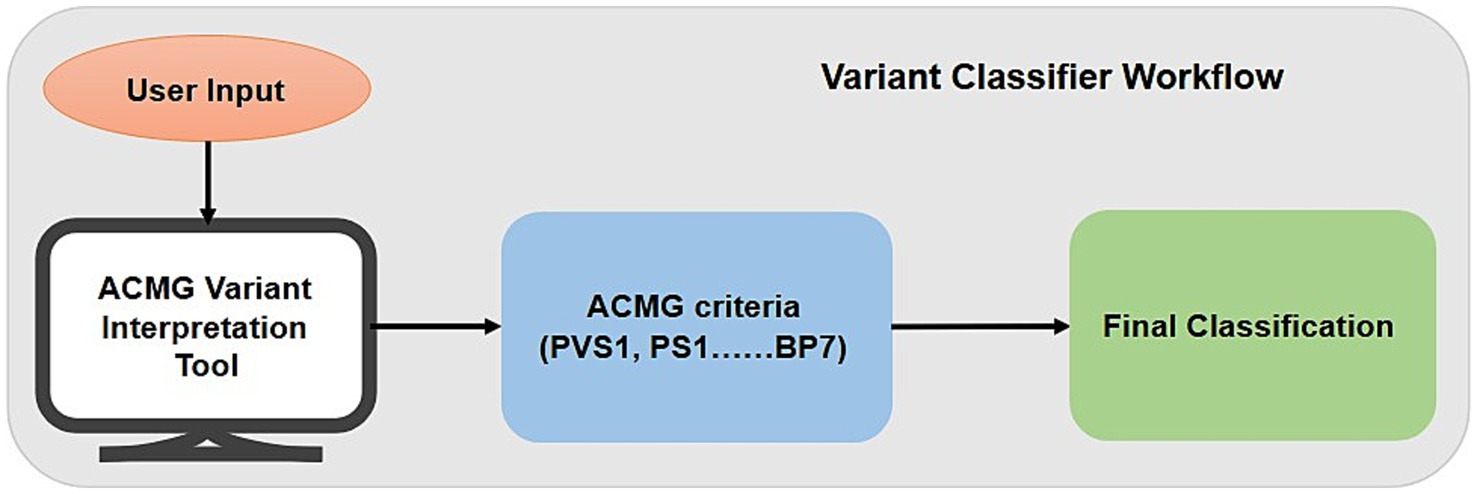 The tool is implemented in JavaScript and follows a hierarchical decision to assign the final classification such as Pathogenic (P), Likely Pathogenic (LP), Benign (B), Likely Benign (LB) and Variant of Uncertain Significance (VUS). The classification logic follows through four sections: