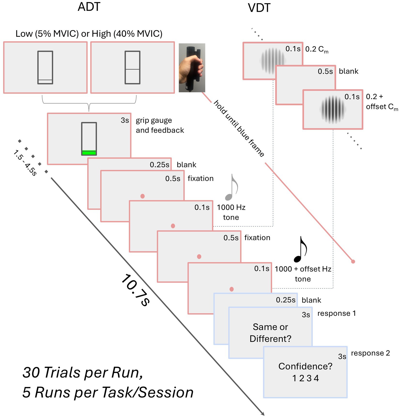 Figure 1. Schematic of the task paradigm. The auditory (ADT) and visual (VDT) tasks share a similar trial structure, differing only in stimuli—two visual Gabors for VDT with certain Michelson contrast (Cm) and two tones for ADT. Participants perform a high (HG) or low grip (LG) squeeze on a dynamometer, maintaining it until the second stimulus ends. They then relax, indicate whether the stimuli were the same, and rate their confidence. Block durations are provided in seconds.