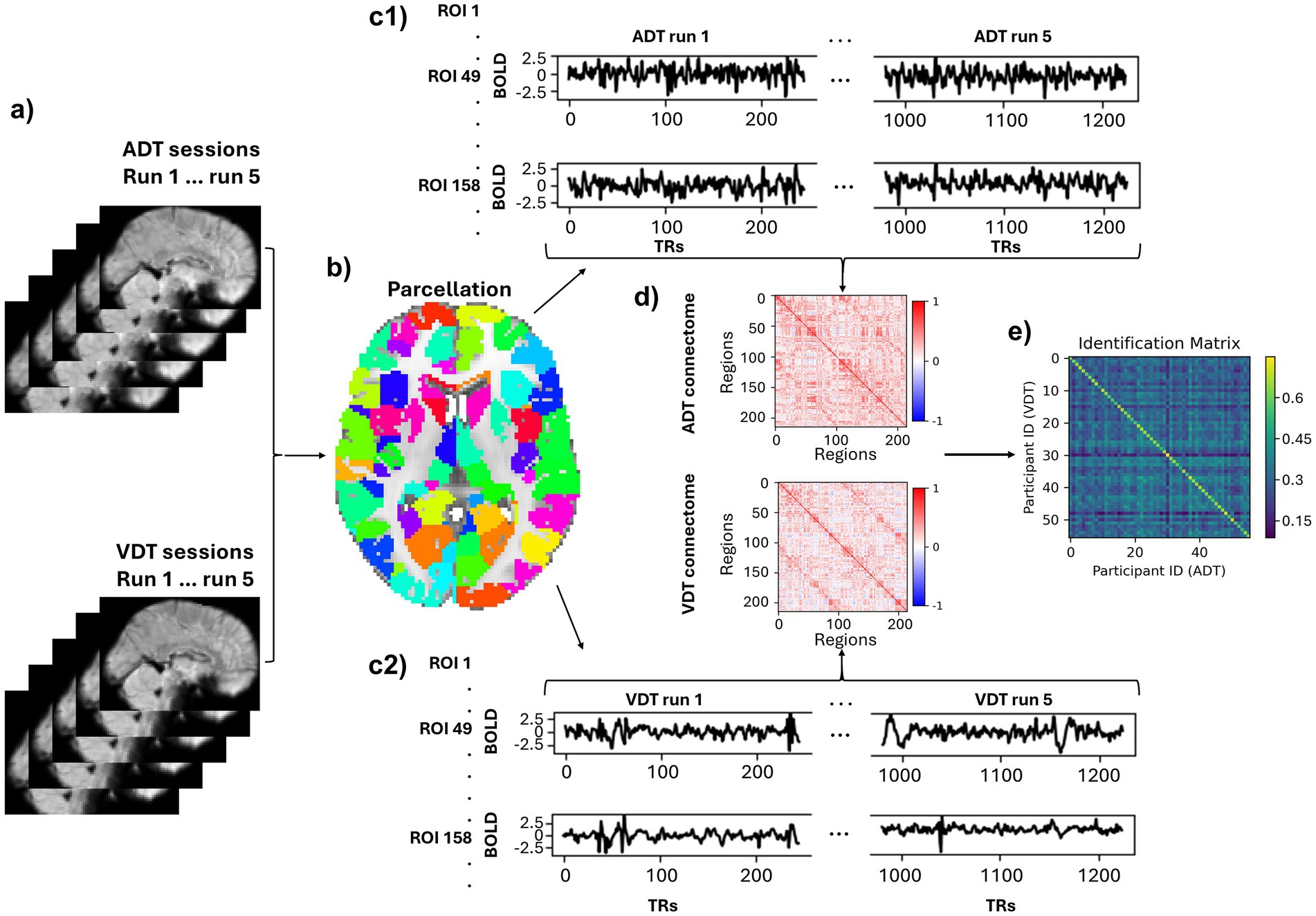Figure 2. Pipeline of deriving participant-based connectomes and identification. (a) A sample fMRI sagittal volume of a subject for each run of each task (b) An axial view of the parcellation. (c1,c2) Time courses of two sample regions (49, 158) normalized and concatenated across the runs. (d) A sample subject’s connectome of the ADT and VDT. (e) Identification matrix. The diagonal elements represent the correlation between the same participants’ connectomes across the two task sessions.