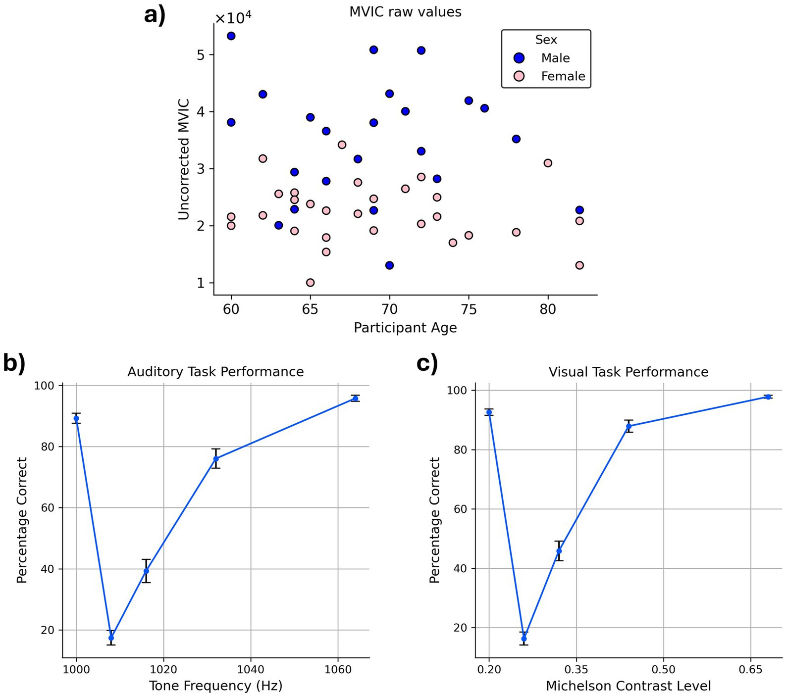 Figure 3. Behavioral task performance. (a) MVIC values. The blue and pink circles in the scatter plot correspond to males and females, respectively. MVIC values are reported in an arbitrary unit reported by the dynamometer. (b,c) Average accuracy across the participants in (b) auditory task (c) visual task. Error bars indicate the standard error of the mean (SEM) across participants.