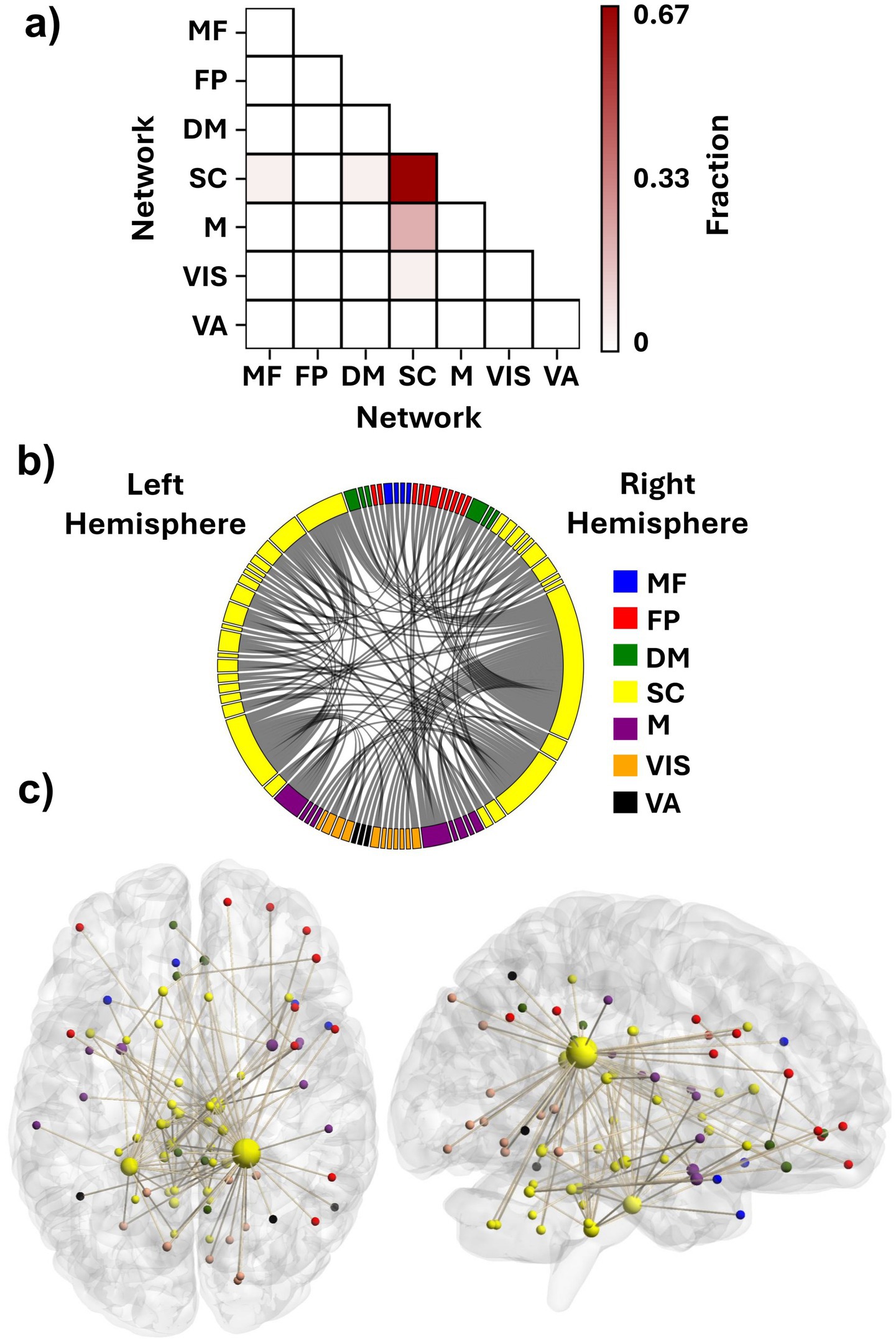 Figure 4. Contributing features to participant identification. (a) Fraction of features with suprathreshold differential power within and between the functional networks. Each element shows what fraction of the discriminative edges resides between the networks. (b) Distribution of the discriminative FCs among the seven investigated networks. (c) An anatomical visualization of the location of the ROIs containing suprathreshold DP features in the brain. Larger regions show a higher number of differentiating FCs. The list of networks is as follows: MF, the medial frontal network; FP, the frontoparietal network; DM, the default mode network; SC, the subcortical-cerebellum network; M, the motor network; VIS, the visual I and II network; VA, the visual association network.