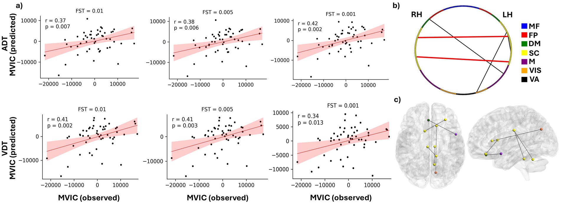 Figure 5. Prediction of MVIC using CPM model. (a) Predicted vs. observed MVIC scores after accounting for effects of age and sex for feature selection thresholds of 0.01, 00.5 and 0.001 for both ADT and VDT tasks. “r” shows the correlation between the predicted and observed MVIC scores, and “p” shows the corresponding p value of the correlation. (b) distribution of the MVIC predictive FCs among the seven investigated networks. RH and LH represent right hemisphere and left hemisphere, respectively. (c) An anatomical visualization of the location of the ROIs with the highest number of MVIC predictive features in the brain. The list of networks is as follows: MF, the medial frontal network; FP, the frontoparietal network; DM, the default mode network; SC, the subcortical and cerebellum network; M, the motor network; VIS, the visual network; VA, the visual association network.